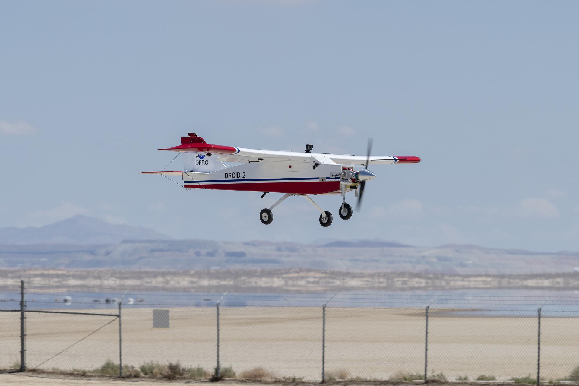 The DROID 2 (Dryden Remotely Operated Integrated Drone 2) prepares to land at NASA's Armstrong Flight Research Center in Edwards, California, as part of the Advanced Exploration of Reliable Operation at Low Altitudes: Meteorology, Simulation, and Technology campaign. The focus was to study wind to provide data for safe takeoff and landing of future air taxis.
