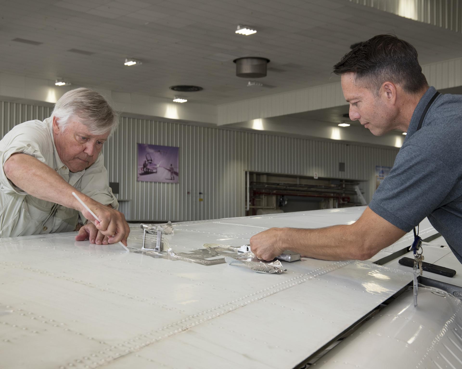 Cal Poly San Luis Obispo Professor Russ Westphal, left, and NASA Armstrong’s Technology Transfer Officer Benjamin Tomlinson remove the Boundary Layer Data System (BLDS) sensor attached to the wing of a Beechcraft Beech 200 Super King Air. The BLDS was flight tested at NASA’s Armstrong Flight Research Center to showcase rapid and flexible flight-testing capabilities.