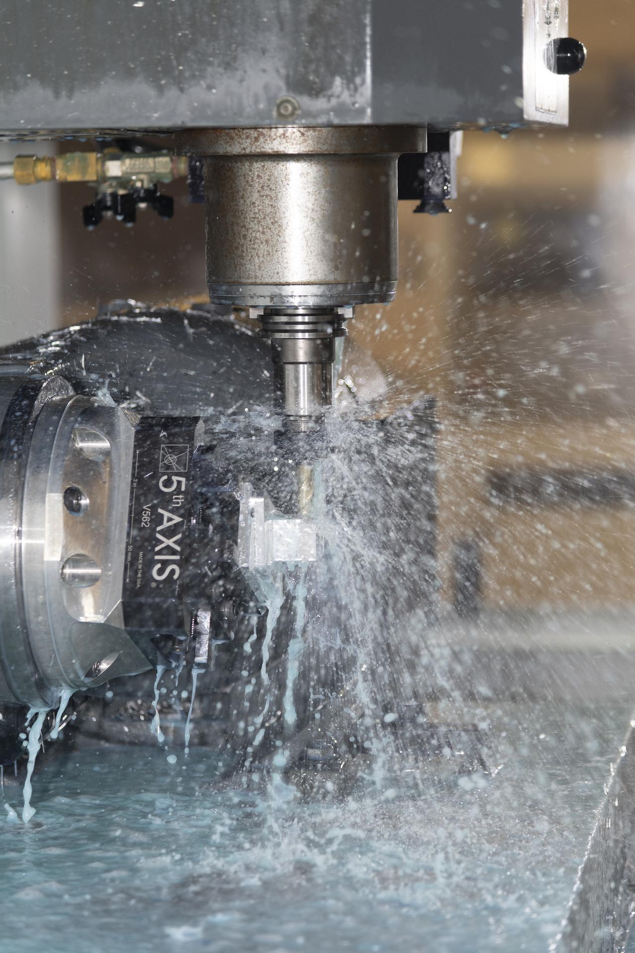 A machine cuts, rotates, and turns a block of aluminum to make a forward wing strut fastener for a 10-foot model of the Transonic Truss-Braced Wing at NASA’s Armstrong Flight Research Center, in Edwards, California. The aircraft concept involves a wing braced on an aircraft using diagonal struts that also add lift and could result in significantly improved aerodynamics.