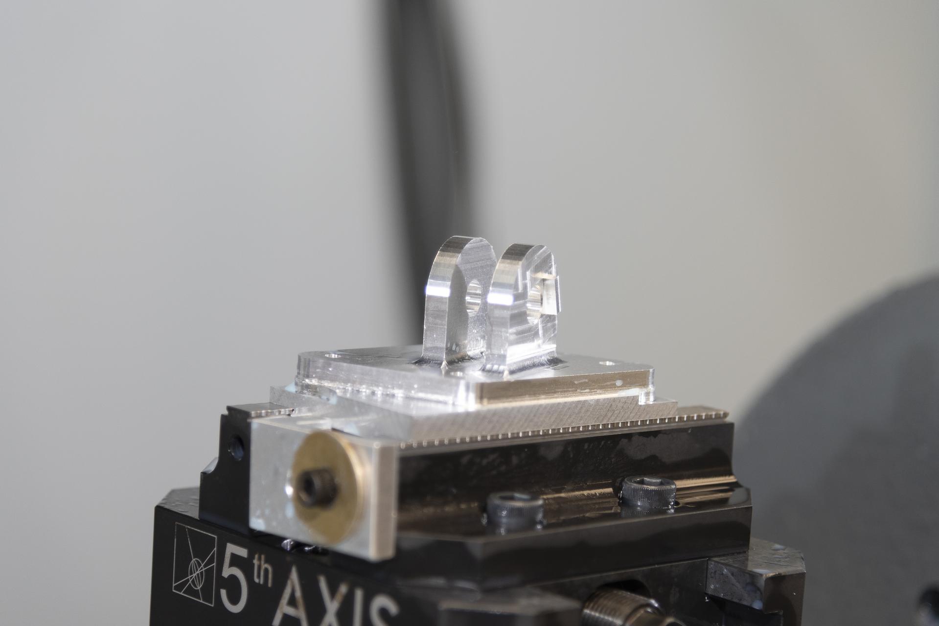 A block of aluminum is transformed by a machine programmed to cut, rotate, and turn it to make a forward wing strut fastener for a 10-foot model of the Transonic Truss-Braced Wing at NASA’s Armstrong Flight Research Center, in Edwards, California. The aircraft concept involves a wing braced on an aircraft using diagonal struts that also add lift and could result in significantly improved aerodynamics.