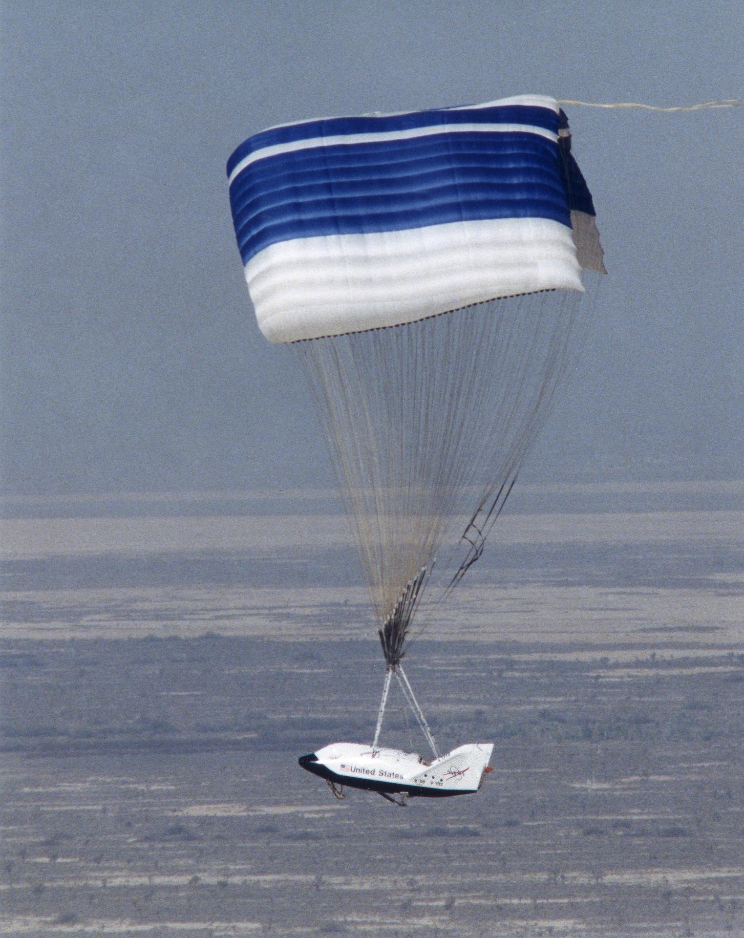 The X-38 technology demonstrator descends under its steerable parafoil toward a lakebed landing in a March 2000 test flight.
