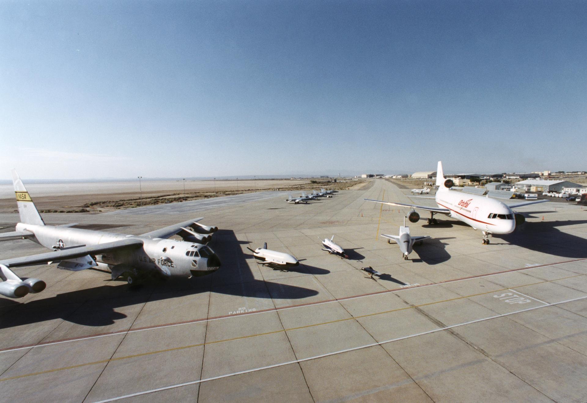 Aerospace industry representatives view actual and mock-up versions of 'X-Planes' intended to enhance access to space during a technical exposition on June 22, 2000 at Dryden Flight Research Center, Edwards, California. From left to right: NASA's B-52 launch aircraft, in service with NASA from 1959 to 2004; a neutral-buoyancy model of the Boeing's X-37; the Boeing X-40A behind the MicroCraft X-43 mock-up; Orbital Science's X-34 and the modified Lockheed L-1011 airliner that was intended to launch the X-34. These X-vehicles are part of NASA's Access to Space plan intended to bring new technologies to bear in an effort to dramatically lower the cost of putting payloads in space, and near-space environments. The June 22, 2000 NASA Reusable Launch Vehicle (RLV) Technology Exposition included presentations on the history, present, and future of NASA's RLV program. Special Sessions for industry representatives highlighted the X-37 project and its related technologies. The X-37 project is managed by NASA's Marshall Space Flight Center, Huntsville, Alabama.