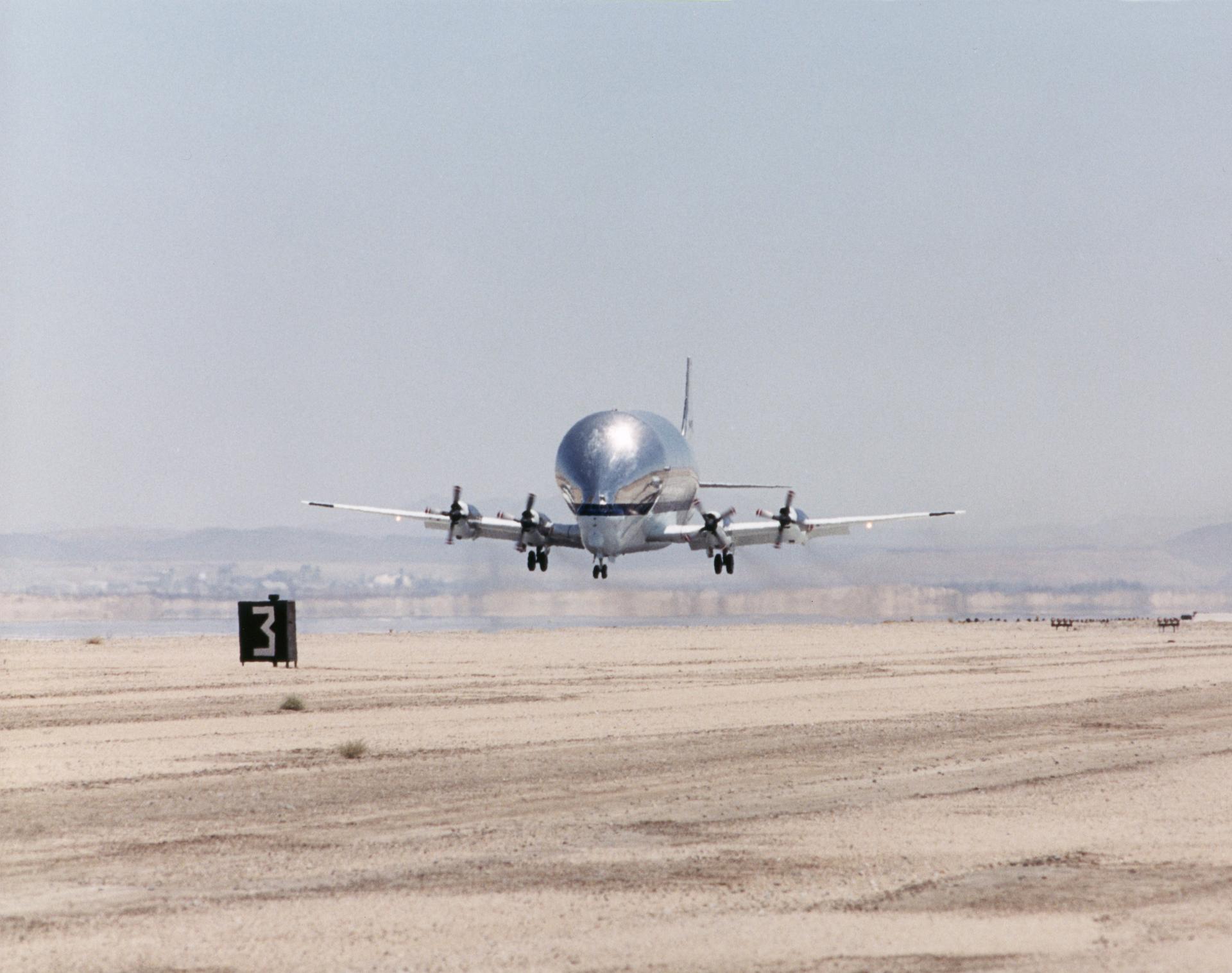 NASA's Super Guppy transport aircraft landed at Edwards Air Force Base, Calif. on July 11, 2000, to deliver the latest version of the X-38 drop vehicle to Dryden. The X-38s are intended as prototypes for a possible "crew lifeboat" for the International Space Station. The X-38 vehicle 131R will demonstrate a huge 7,500 square-foot parafoil that will that will enable the potential crew return vehicle to land on the length of a football field after returning from space. The crew return vehicle is intended to serve as a possible emergency transport to carry a crew to safety in the event of problems with the International Space Station. The Super Guppy evolved from the 1960s-vintage Pregnant Guppy, used for transporting outsized sections of the Apollo moon rocket. The Super Guppy was modified from 1950s-vintage Boeing C-97. NASA acquired its Super Guppy from the European Space Agency in 1997.