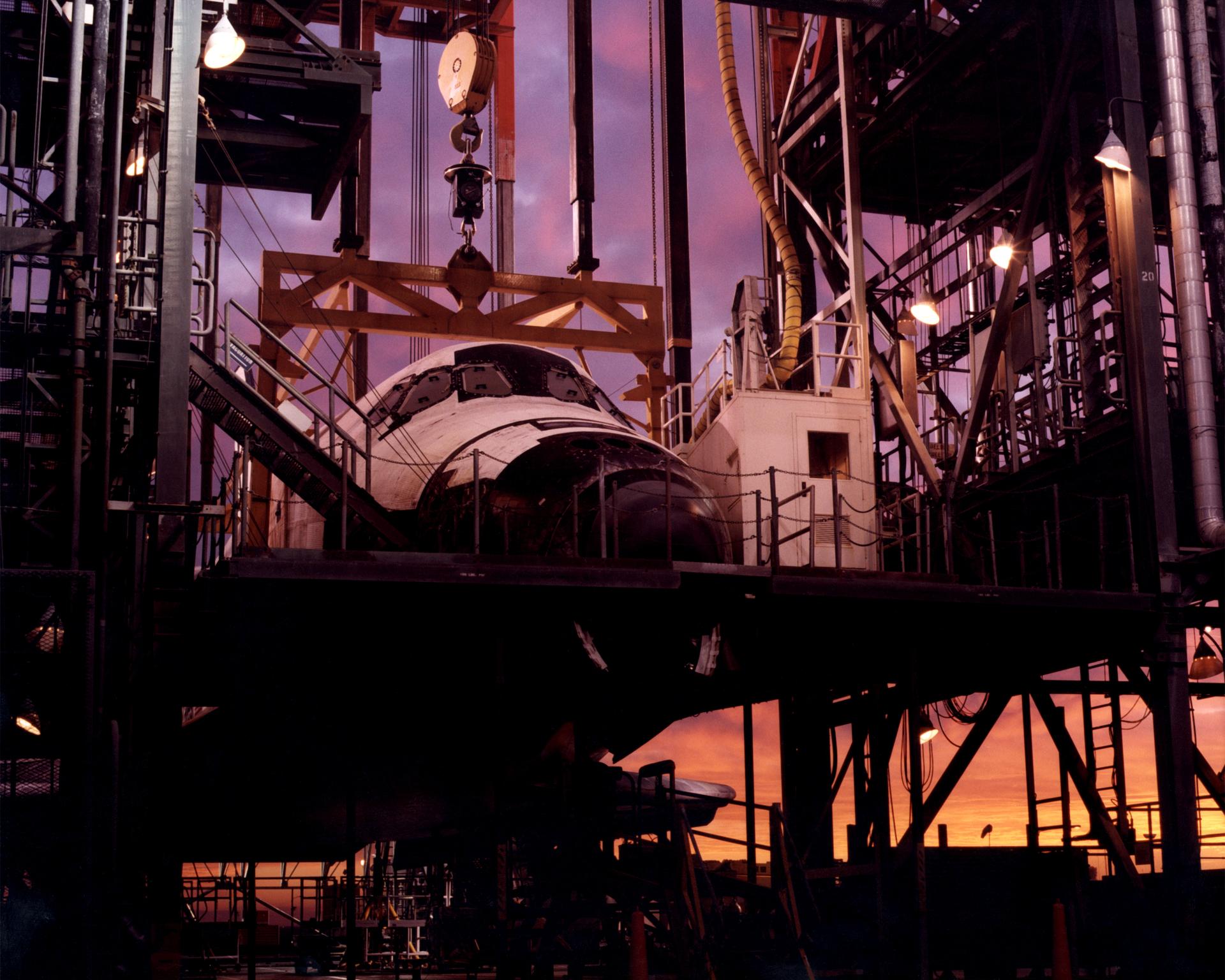 The early-morning Sun bathes the Space Shuttle Discovery in hues of purple, pink and gold as it is encased in the Mate-Demate Device (MDD) at NASA’s Dryden Flight Research Center at Edwards, California. The gantry-like MDD structure is used to prepare the shuttle for its ferry flight back to the Kennedy space Center in Florida, including mounting the shuttle atop NASA’s modified Boeing 747 Shuttle Carrier Aircraft.