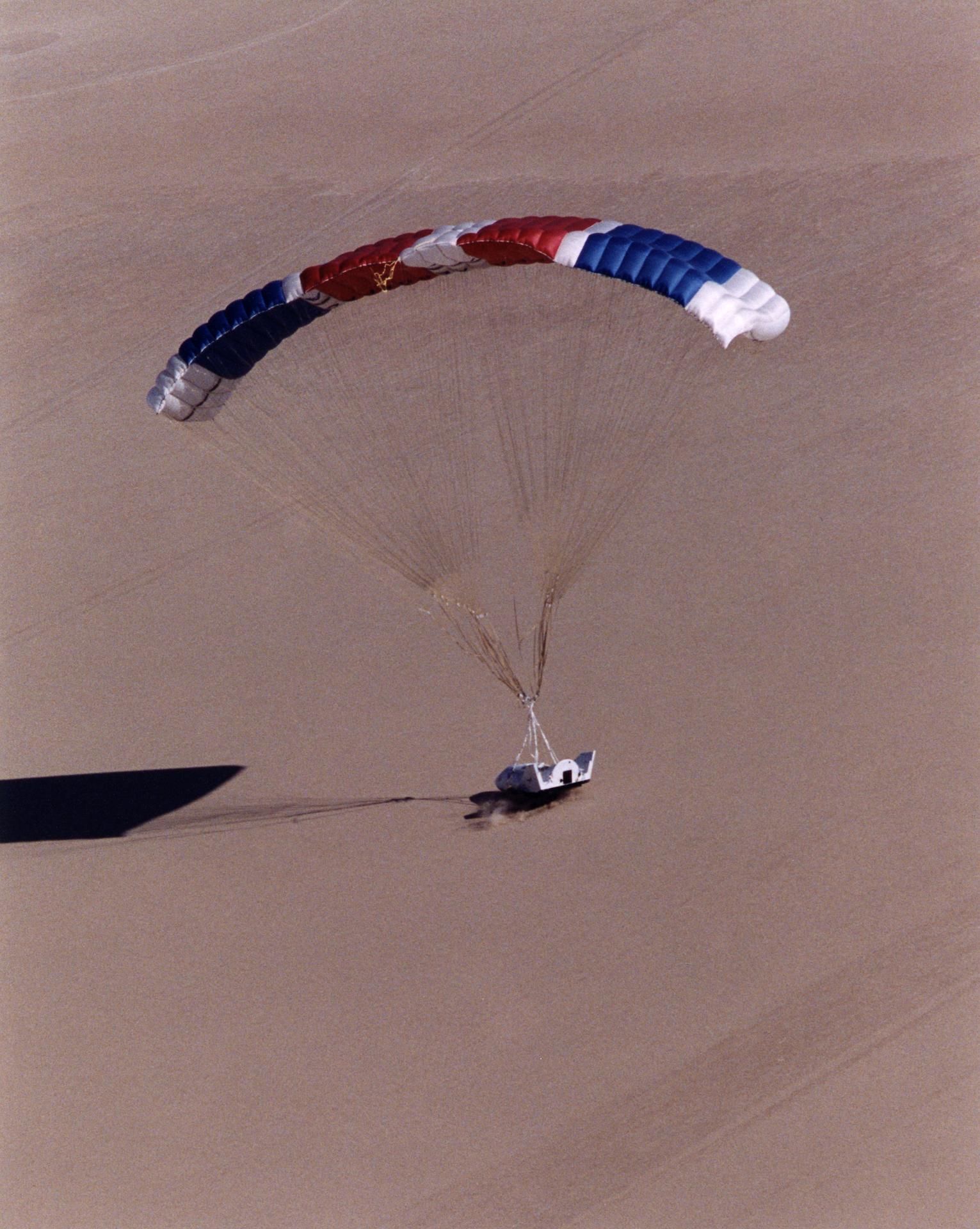 The latest version of the X-38, V-131R, touches down on Rogers Dry Lake adjacent to NASAÕs Dryden Flight Research Center at Edwards, California, at the end of its first free flight under a giant parafoil on Nov. 2, 2000. The X-38 prototypes are intended to perfect technology for a planned Crew Return Vehicle (CRV) ÒlifeboatÓ to carry a crew to safety in the event of an emergency on the International Space Station. Free-flight tests of X-38 V-131R are evaluating upgraded avionics and control systems and the aerodynamics of the modified upper body, which is more representative of the final design of the CRV than the two earlier X-38 test craft, including a simulated hatch atop the body. The huge 7,500 square-foot parafoil will enable the CRV to land in the length of a football field after returning from space. The first three X-38Õs are air-launched from NASAÕs venerable NB-52B mother ship, while the last version, V-201, will be carried into space by a Space Shuttle and make a fully autonomous re-entry and landing.