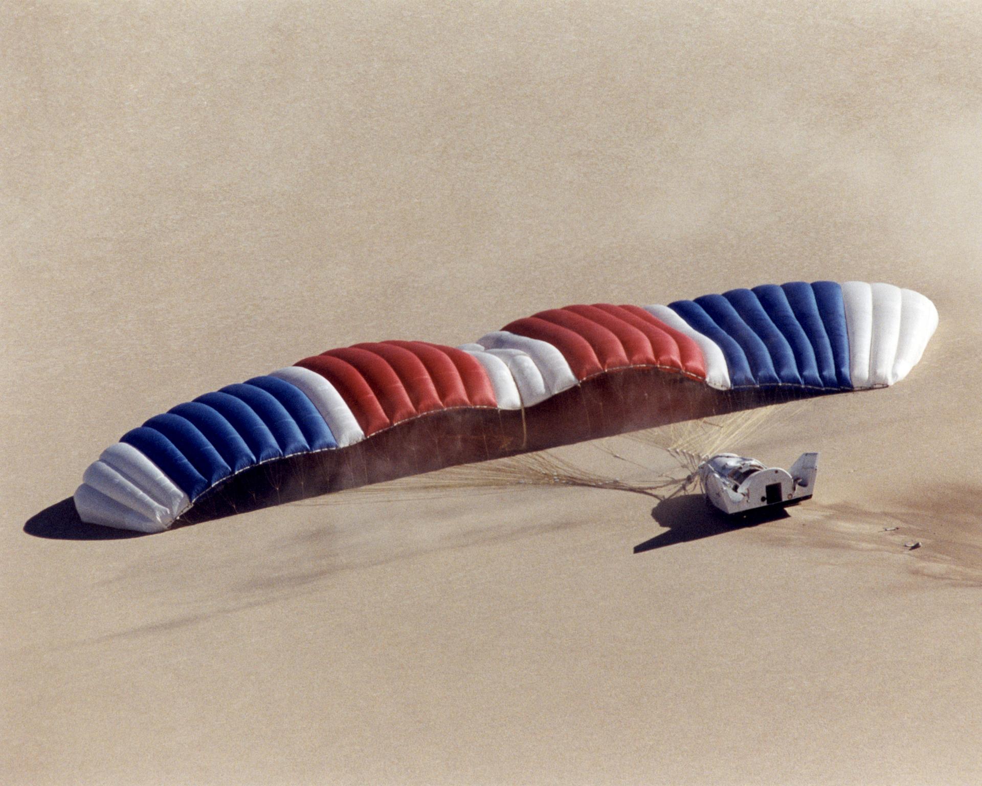 The world’s largest parafoil slowly deflates after carrying the X-38, V-131R, to a safe landing