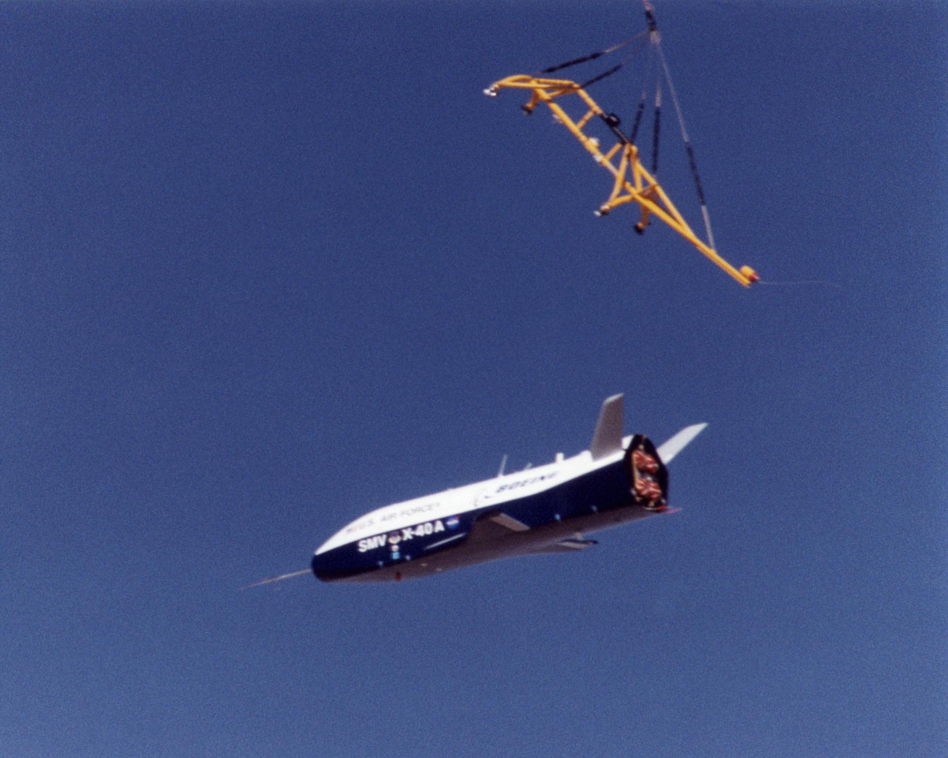 The X-40A immediately after release from its harness suspended from a helicopter 15,000 feet above NASA's Dryden Flight Research Center at Edwards Air Force Base, California, on March 14, 2001. The unpiloted X-40 is a risk-reduction vehicle for the X-37, which is intended to be a reusable space vehicle. NASA's Marshall Space Flight Center in Huntsville, Ala, manages the X-37 project. At Dryden, the X-40A will undergo a series of ground and air tests to reduce possible risks to the larger X-37, including drop tests from a helicopter to check guidance and navigation systems planned for use in the X-37. The X-37 is designed to demonstrate technologies in the orbital and reentry environments for next-generation reusable launch vehicles that will increase both safety and reliability, while reducing launch costs from $10,000 per pound to $1,000 per pound.