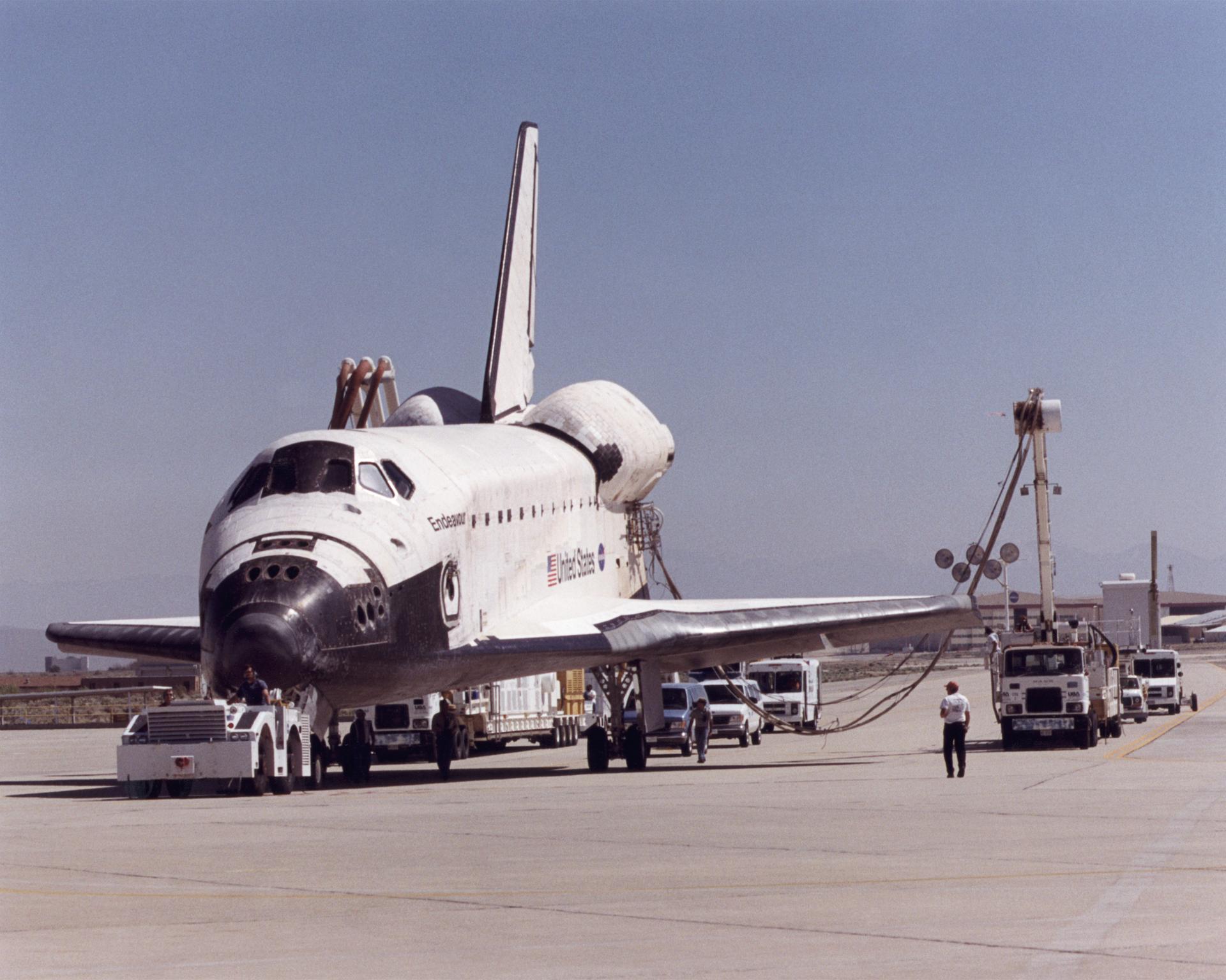 A convoy of specialized support vehicles follow the Space Shuttle Endeavour as it is towed up a taxiway at NASA's Dryden Flight Research Center on Edwards Air Force Base, California, after landing on May 1, 2001. The two largest vehicles trailing the shuttle provide electrical power and air conditioning to the shuttle's systems during post-flight recovery operations. The Endeavour had just completed mission STS-100, an almost 12-day mission to install the Canadarm 2 robotic arm and deliver some three tons of supplies and experiments to the International Space Station. The landing was the 48th shuttle landing at Edwards since shuttle flights began in 1981. After post-flight processing, the Endeavour was mounted atop one of NASA's modified Boeing 747 shuttle carrier aircraft and ferried back to the Kennedy Space Center in Florida on May 8, 2001.