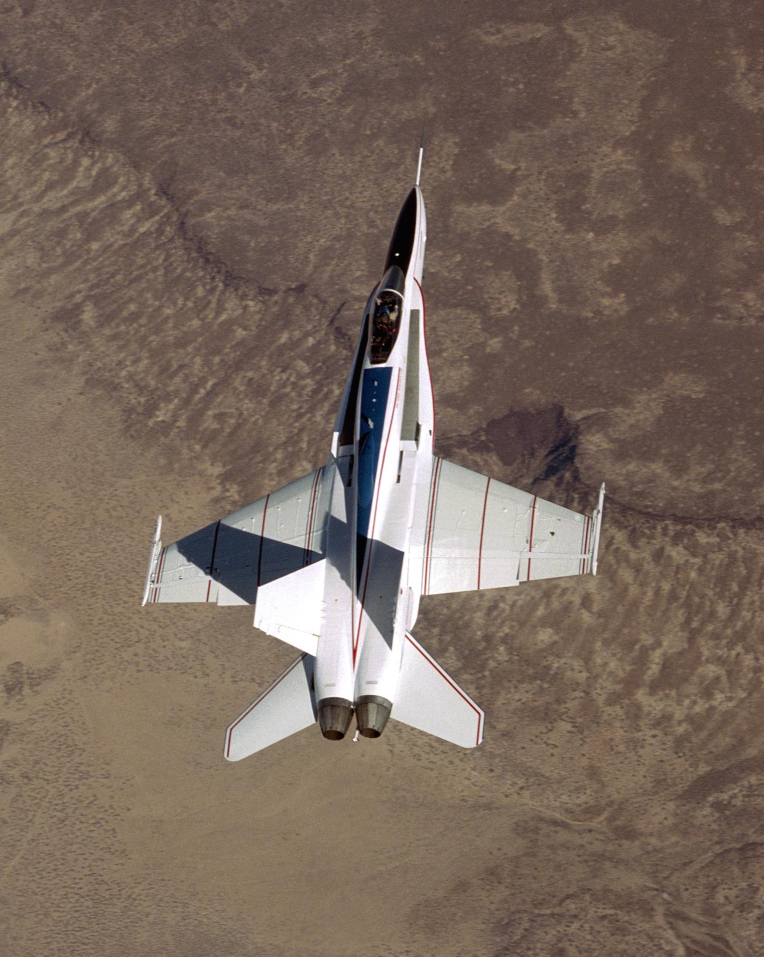 The modified F/A-18 being flown in the joint NASA/Air Force Active Aeroelastic Wing research program shows off its colors during its first checkout flight from NASA's Dryden Flight Research Center.