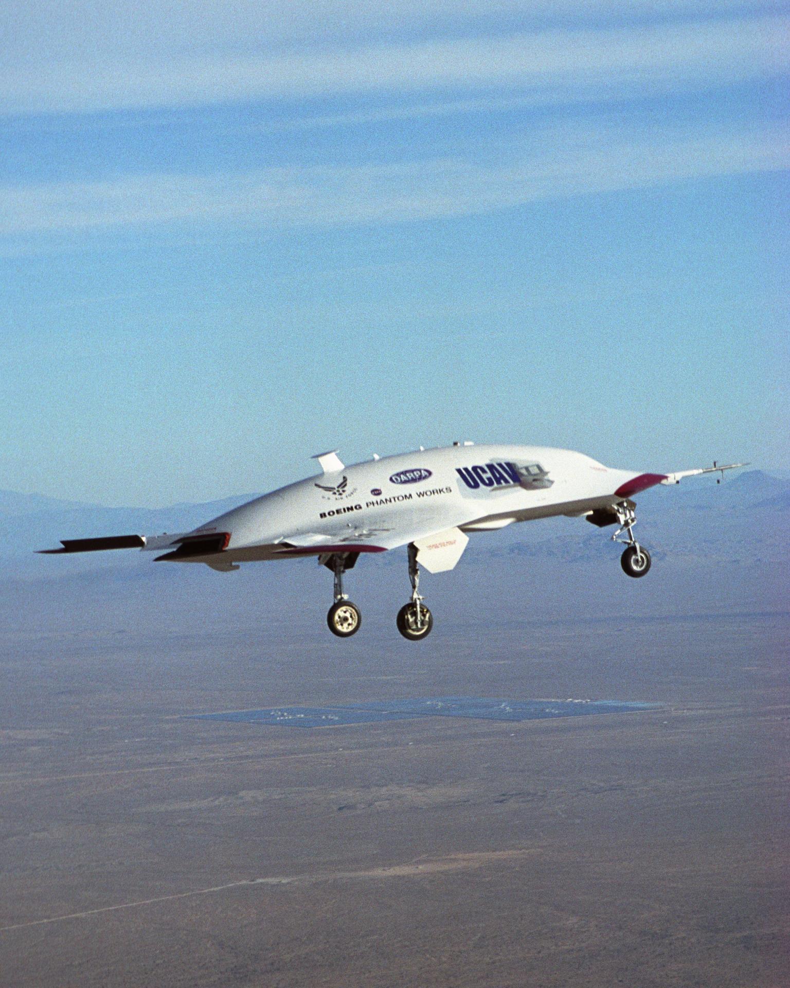 The second X-45A Unmanned Combat Air Vehicle (UCAV) technology demonstrator aircraft during its maiden flight. The flight marks another milestone for the UCAV program, and verified the aircraft’s flight control software