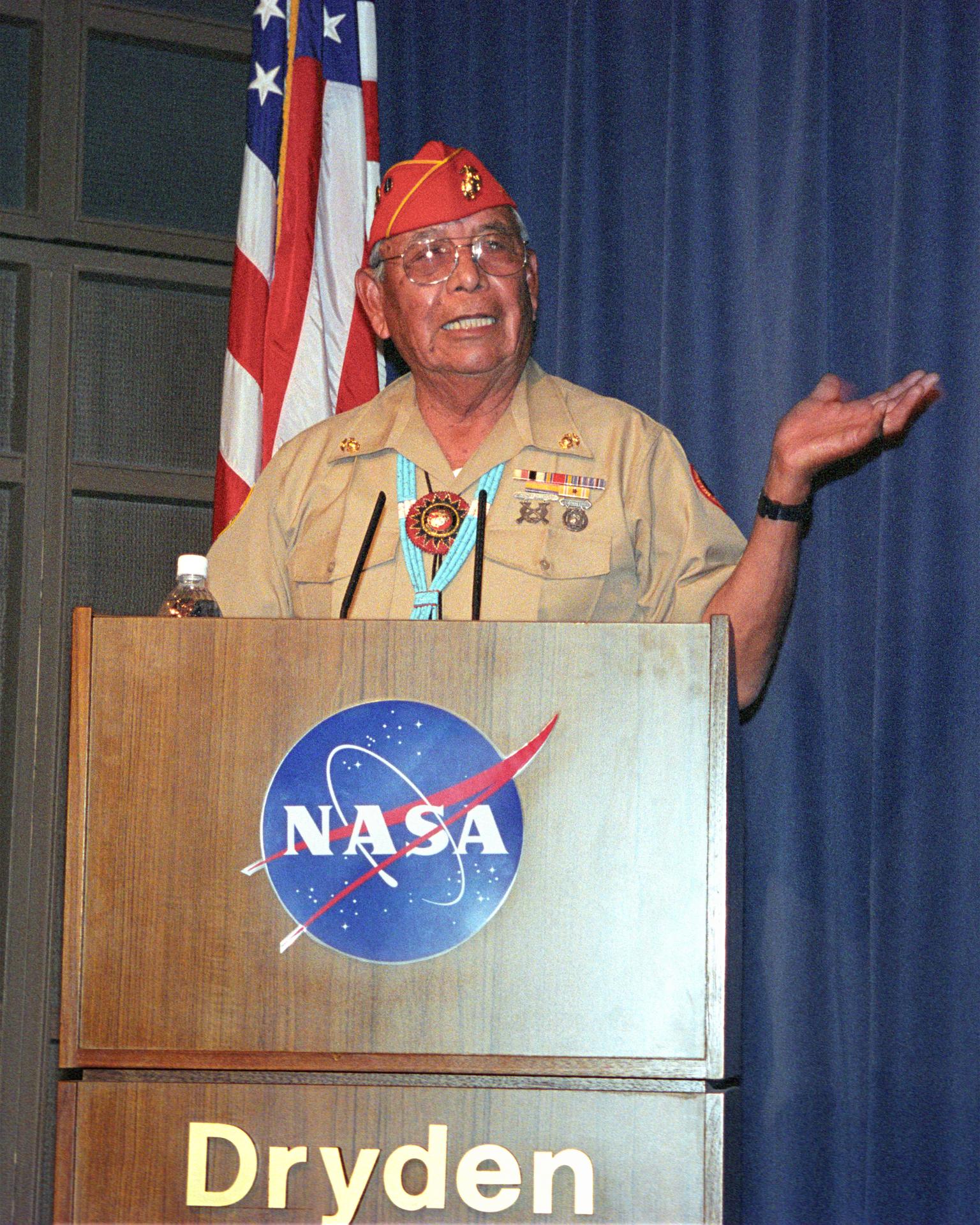 Navajo Code Talker Joe Morris, Sr. shared insights from his time as a secret World War Two messenger with his audience at NASA's Dryden Flight Research Center on Nov. 26, 2002. NASA Dryden is located on Edwards Air Force Base in California's Mojave Desert.