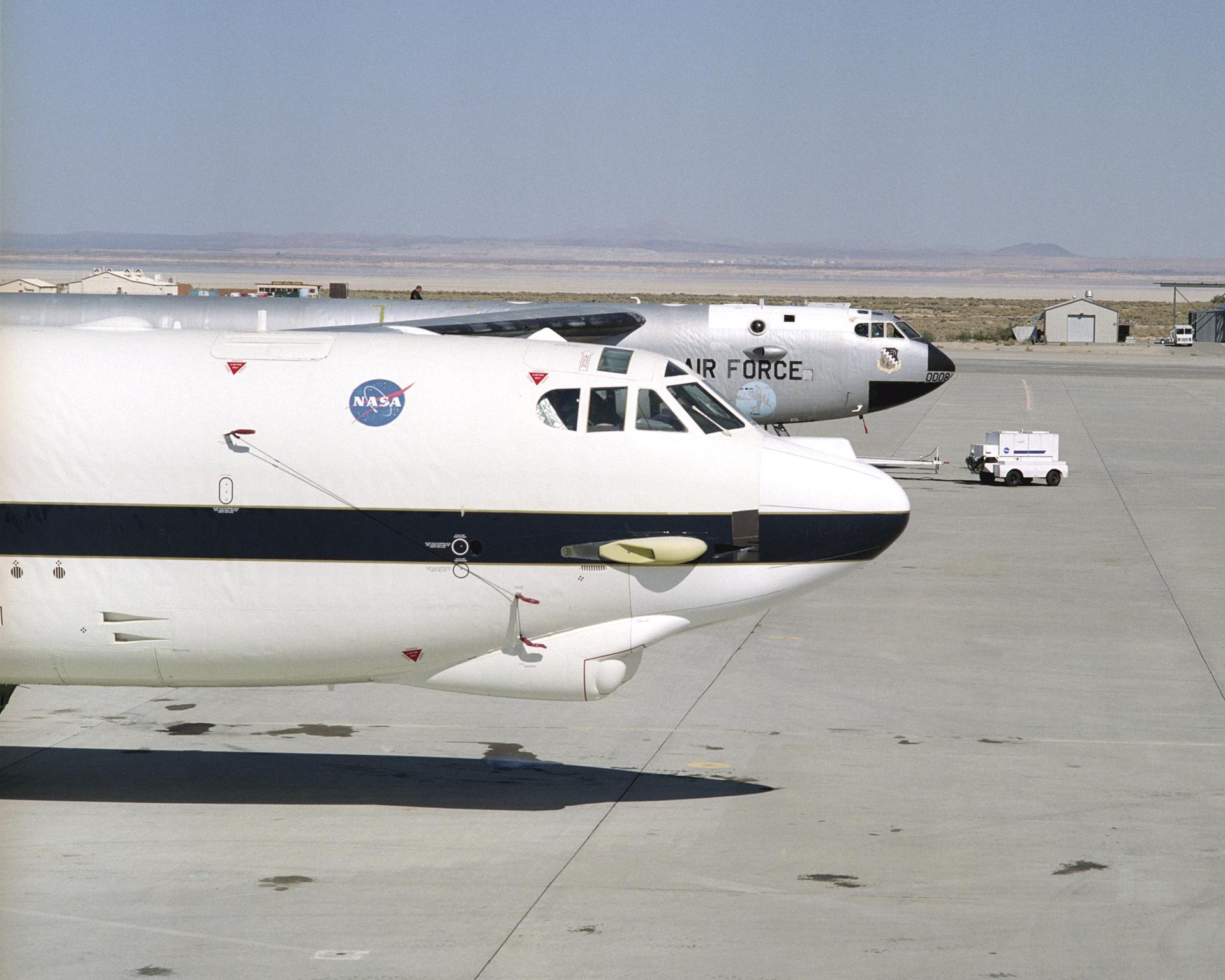 NASA's new B-52H mother ship at the ready, with renowned NASA B-52B 008 poised beside.