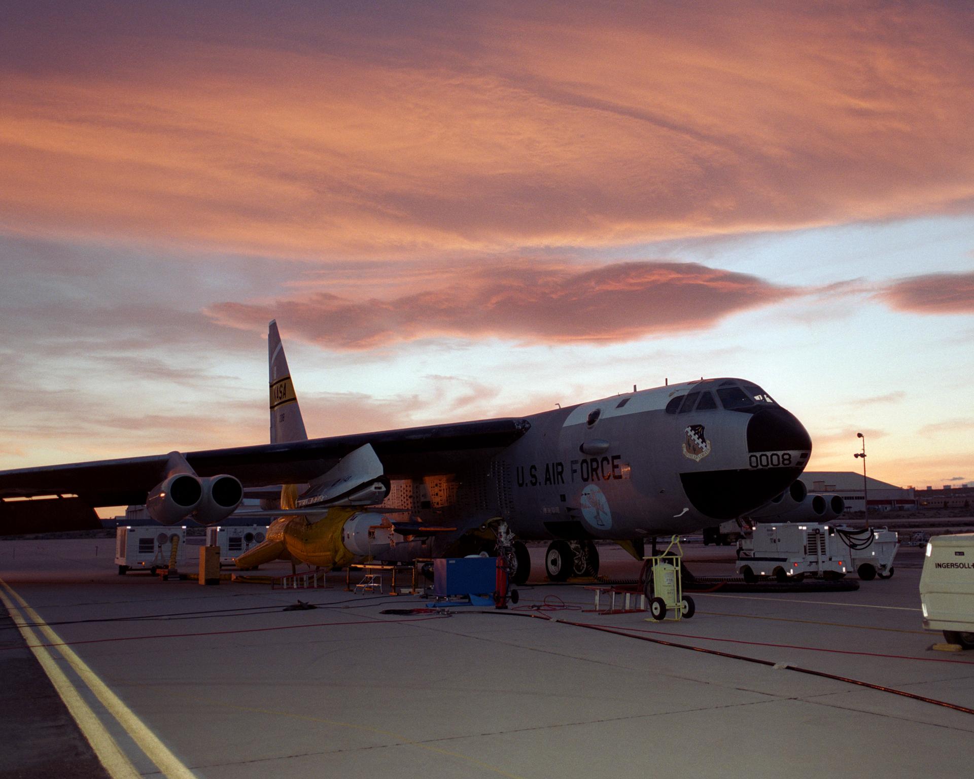 NASA’s B-52B launch aircraft at sunset with the second X-43A hypersonic research vehicle attached to a modified Pegasus rocket under its right wing