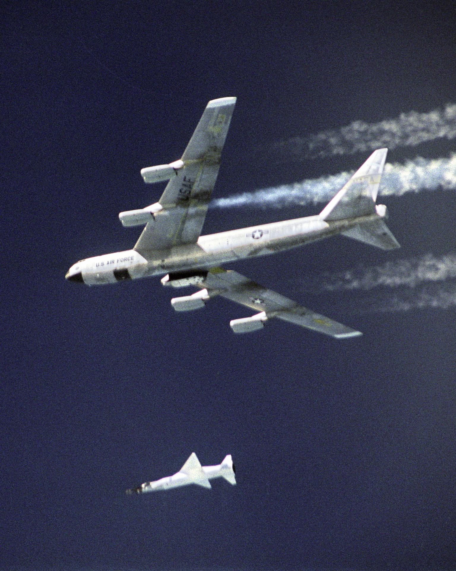 The second X-43A hypersonic research aircraft and its modified Pegasus booster rocket drop away from NASA's B-52B launch aircraft over the Pacific Ocean on March 27, 2004. The mission originated from the NASA Dryden Flight Research Center at Edwards Air Force Base, Calif. Moments later the Pegasus booster ignited to accelerate the X-43A to its intended speed of Mach 7.