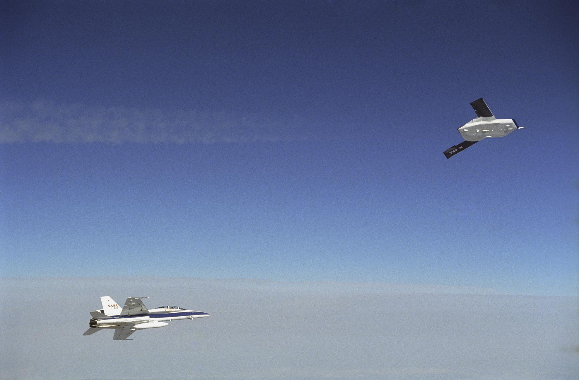 X-45A in flight with F-18 #846 chase aircraft, during first GPS-guided weapon demonstration flight.