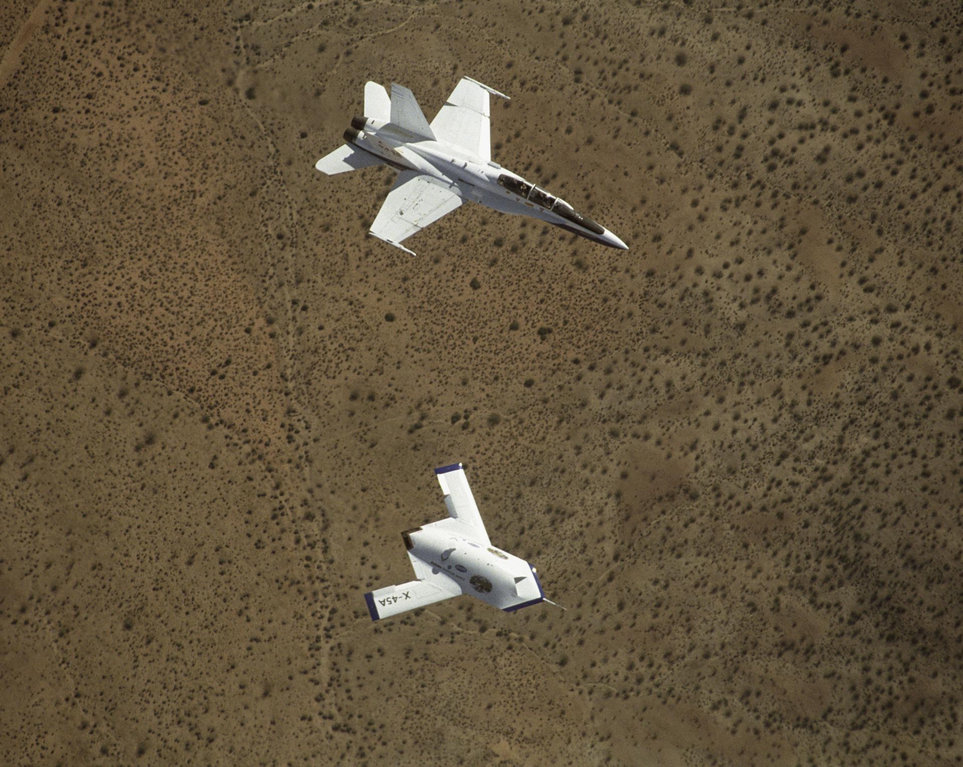 X-45A in flight with F-18 #846 chase aircraft, during first GPS-guided weapon demonstration flight.