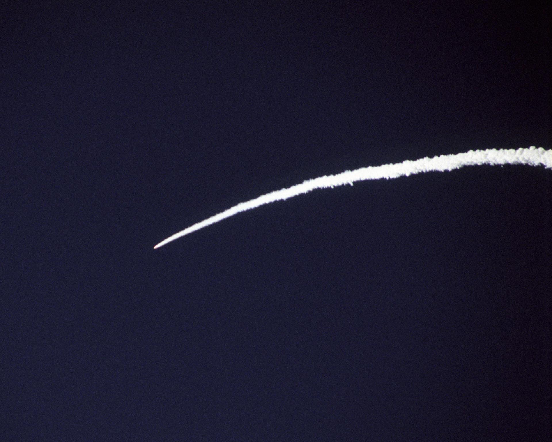 The Pegasus rocket that powered NASA’s X-43A scramjet to almost Mach 10 test conditions leaves a bright arc in the Pacific sky during the boost phase