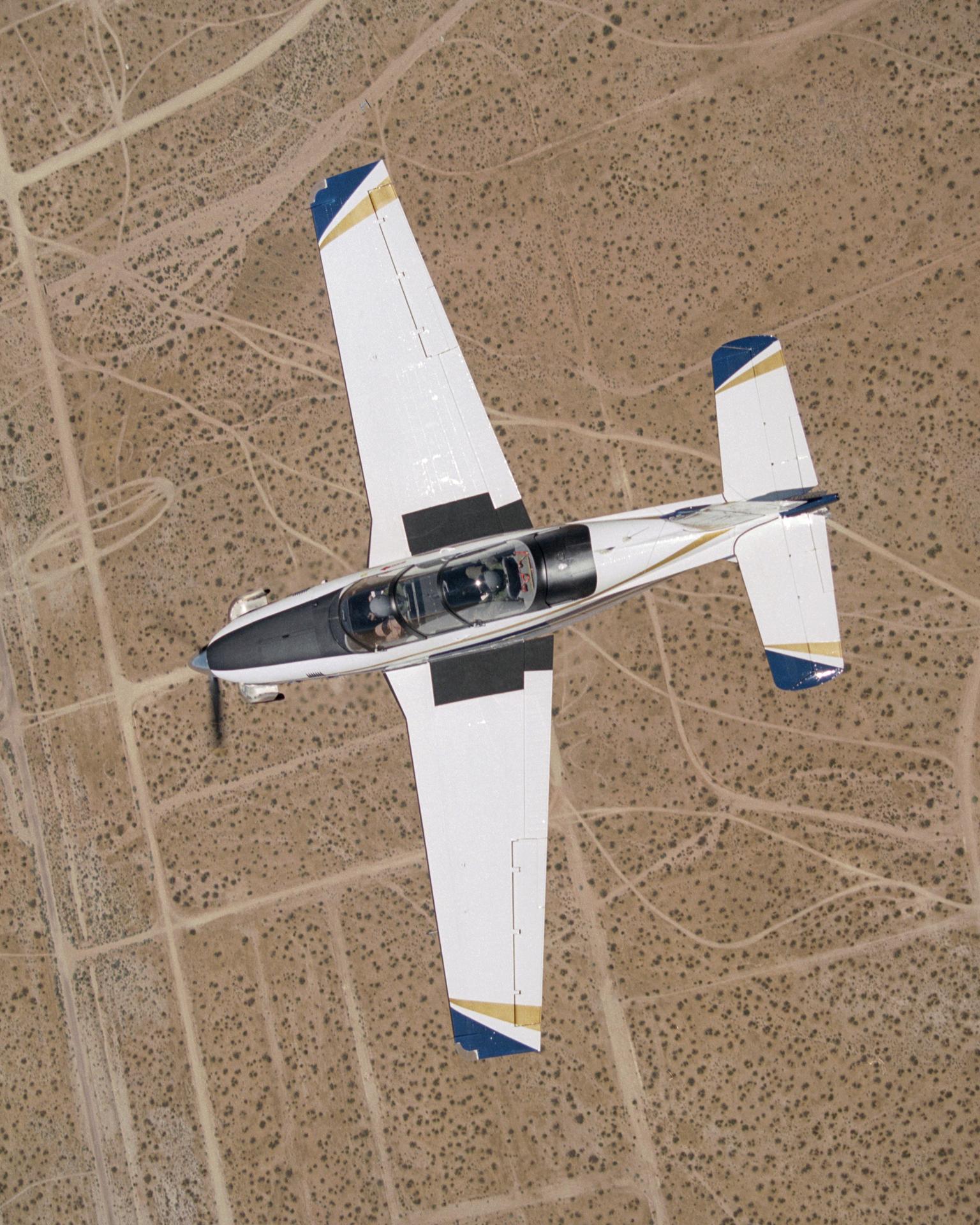 A Beech T-34C mission support aircraft flown by NASA Dryden Flight Research Center shows off its classic lines as it soars over the desert near Edwards AFB
