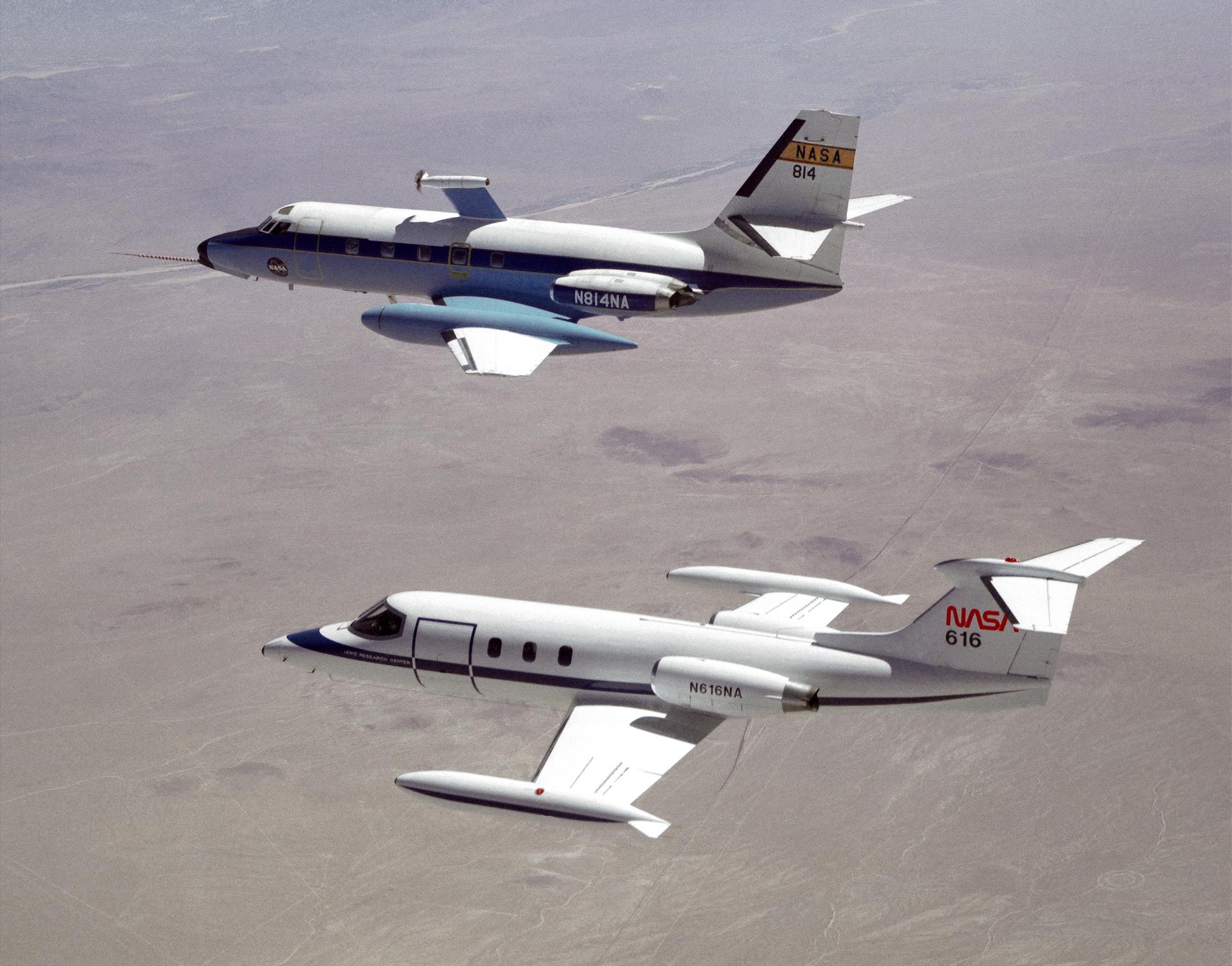 The NASA C-140 JetStar research aircraft (top) is followed by a NASA Learjet equipped with acoustic sensors during one of several tests of advanced propellors mounted on the vertical pylon atop the JetStar's fuselage. Several advanced prop designs were tested on the JetStar in 1982 by NASA's Dryden Flight Research Facility (DFRF), Edwards, California, to study the effects of noise created by propellors on aircraft structures and cabin interiors. To assess possible noise problems with the subscale turbofan, DFRF technicians mounted microphones on both the JetStar and the Learjet chase plane. DFRF then made measurements at close range and at longer distances. The data enabled structural changes and flightpath modifications.
