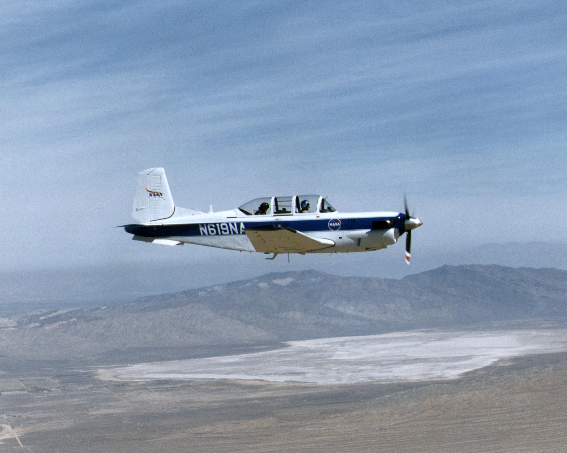 A NASA T-34C aircraft, used for safety chase, is shown flying above the Dryden Flight Research Center, Edwards, California in March 1997. The aircraft was previously used at the Lewis Research Center in propulsion experiments involving turboprop engines, and was used as a chase aircraft at Dryden for smaller and slower research projects. Chase aircraft accompany research flights for photography and video purposes, and also as support for safety and research. At Dryden, the T-34 is used mainly for smaller remotely piloted vehicles which fly slower than NASA's F-18's, used for larger scale projects. This aircraft was returned to the U.S. Navy in May of 2002. The T-34C, built by Beech, carries a crew of 2 and is nicknamed the Mentor.