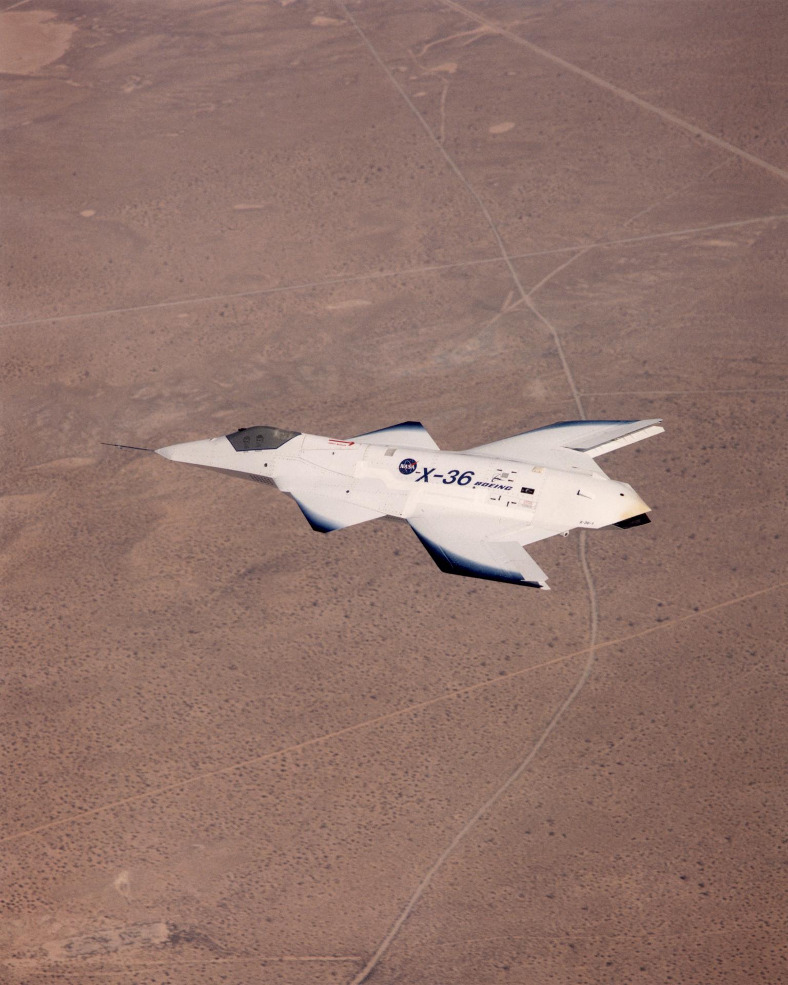 The tailless X-36 technology demonstrator research aircraft cruises over the California desert at low altitude during a 1997 research flight.