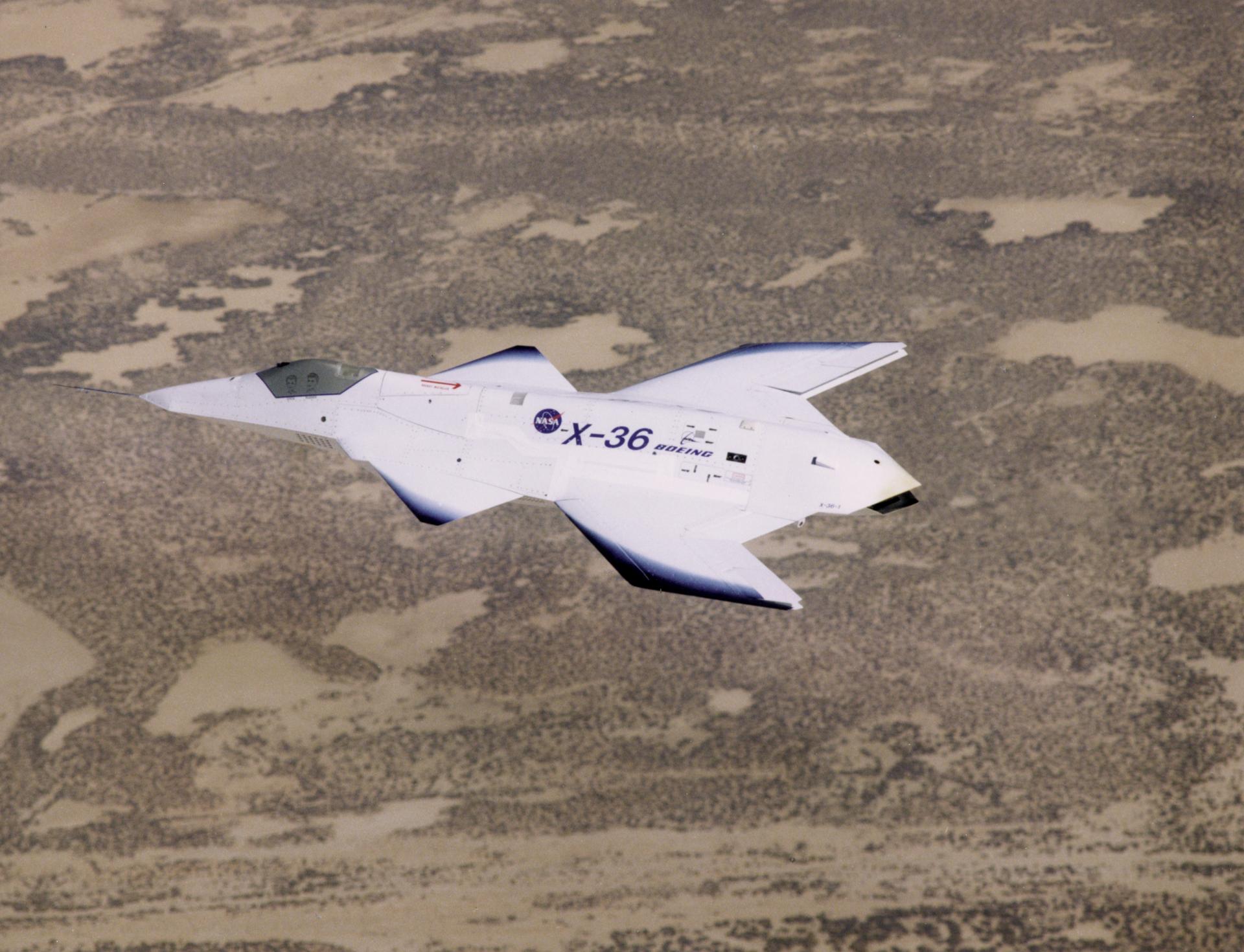 The unusual lines of the X-36 technology demonstrator contrast sharply with the desert floor as the remotely piloted aircraft scoots across the California desert at low altitude during a research flight on October 30, 1997.