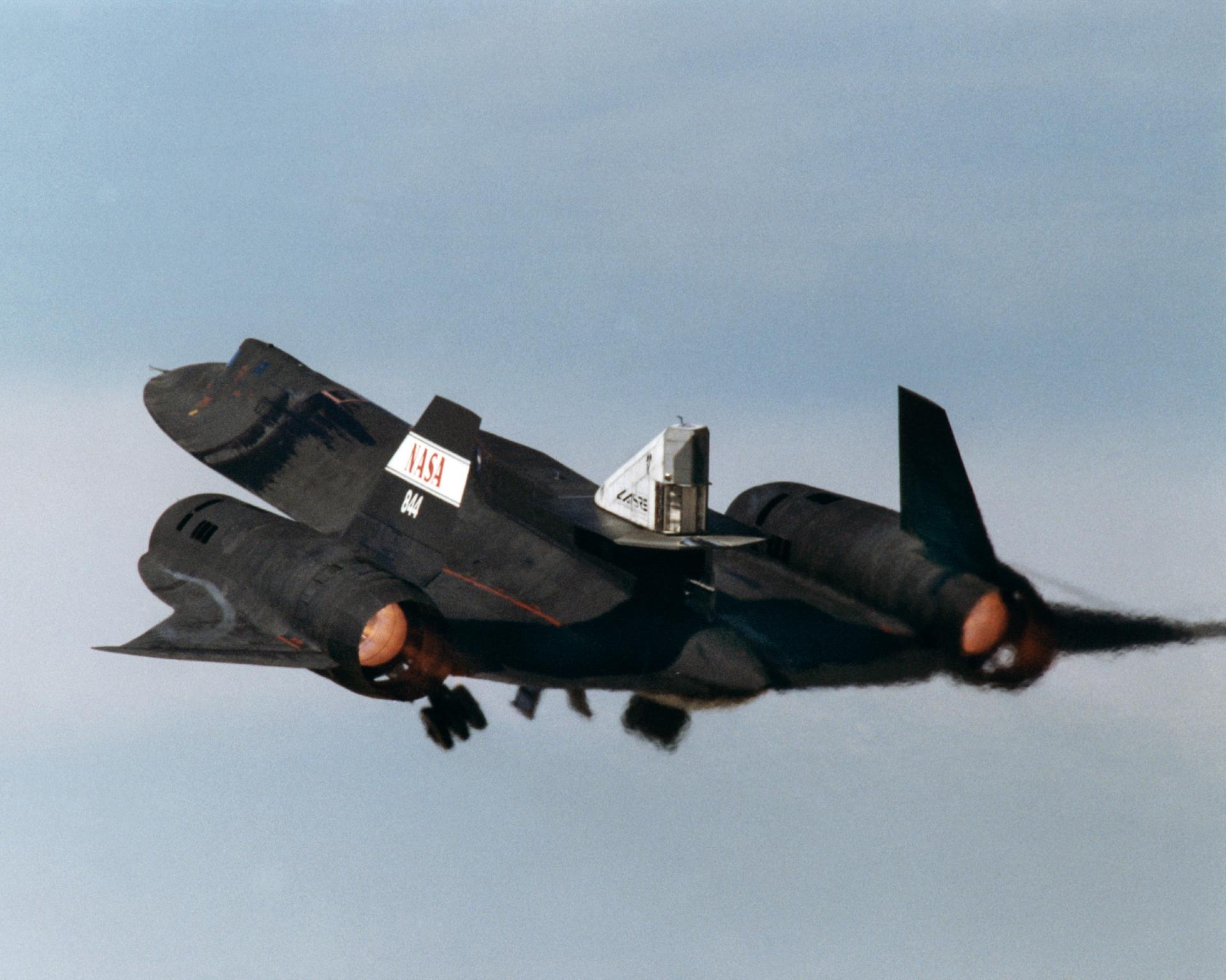 This photograph shows the LASRE pod on the upper rear fuselage of an SR-71 aircraft during take-off of the first flight to experience an in-flight cold flow test. The flight occurred on 4 March 1998.