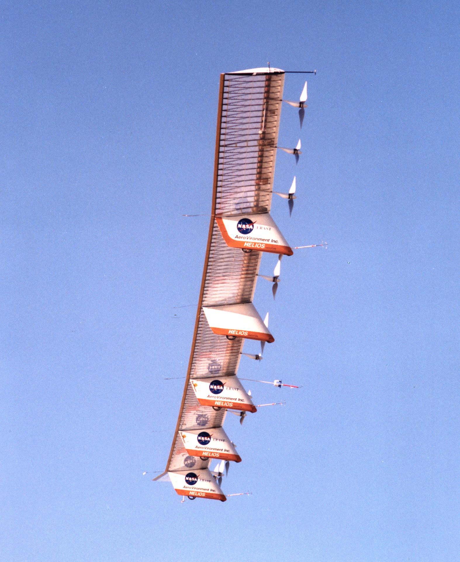 The Helios Prototype is an enlarged version of the Centurion flying wing, which flew a series of test flights at Dryden in late 1998. The craft has a wingspan of 247 feet, 41 feet greater than the Centurion, 2 1/2 times that of its solar-powered Pathfinder flying wing, and longer than either the Boeing 747 jetliner or Lockheed C-5 transport aircraft.