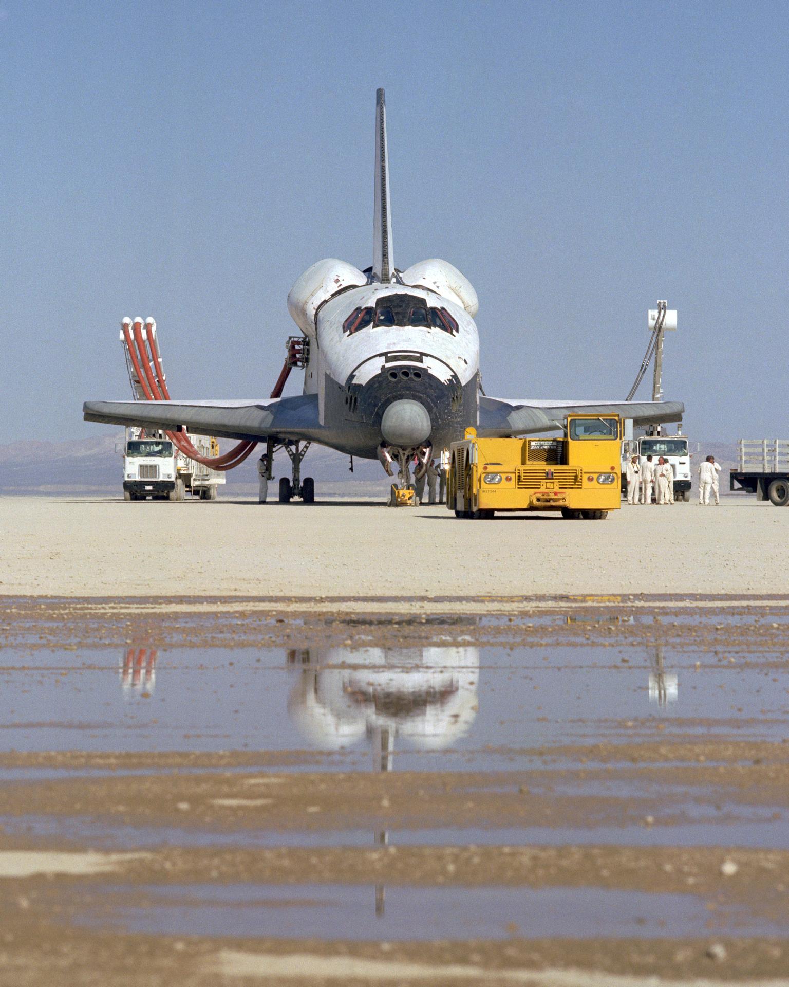 The Space Shuttle Columbia on Rogers Dry lakebed at Edwards AFB after landing to complete its first orbital mission on April 14, 1981. Technicians towed the Shuttle back to the NASA Dryden Flight Research Center for post-flight processing and preparation for a return ferry flight atop a modified 747 to Kennedy Space Center in Florida.