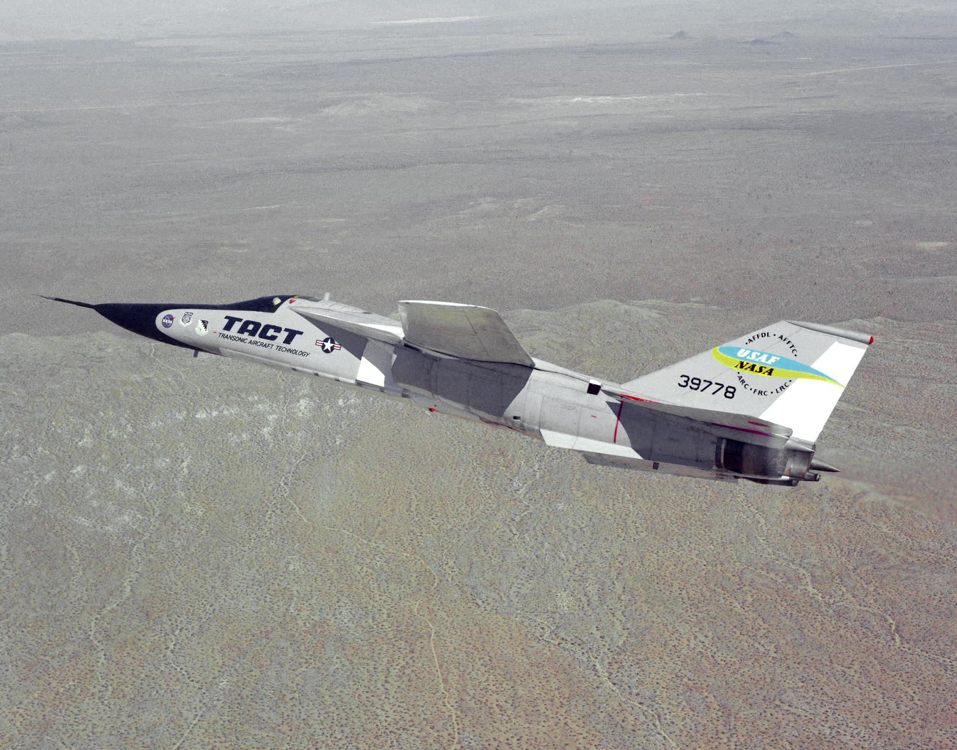 The General Dynamics TACT/F-111A Aardvark is seen In a banking-turn over the California Mojave desert. This photograph affords a good view of the supercritical wing airfoil shape. Starting in 1971 the NASA Flight Research Center and the Air Force undertook a major research and flight testing program, using F-111A (#63-9778), which would span almost 20 years before completion. Intense interest over the results coming from the NASA F-8 supercritical wing program spurred NASA and the Air Force to modify the General Dynamics F-111A to explore the application of supercritical wing technology to maneuverable military aircraft. This flight program was called Transonic Aircraft Technology (TACT).