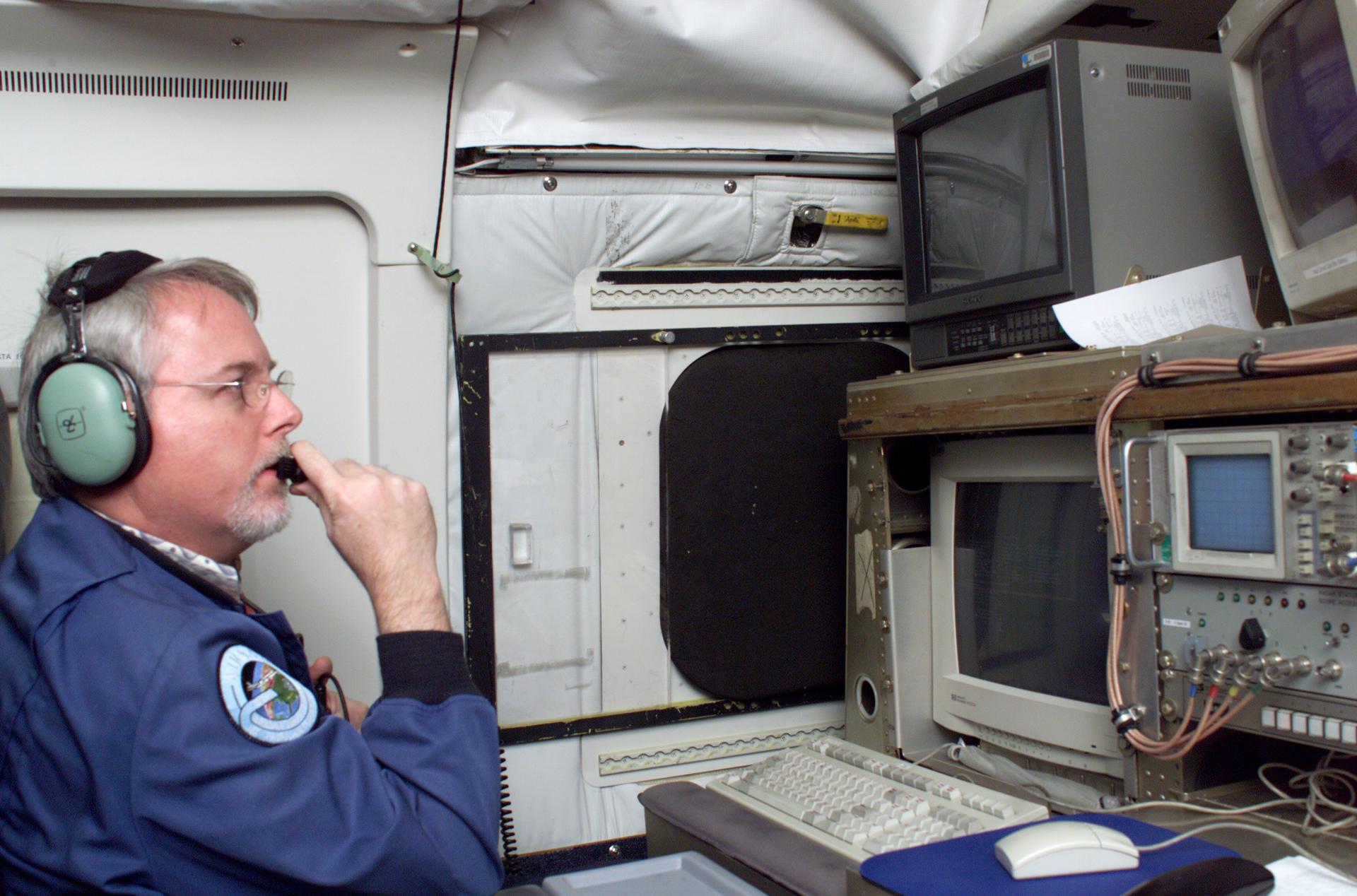 JPL Researcher Tim Miller at the primary AirSAR station aboard NASA’s DC-8 flying laboratory during the AirSAR 2004 campaign