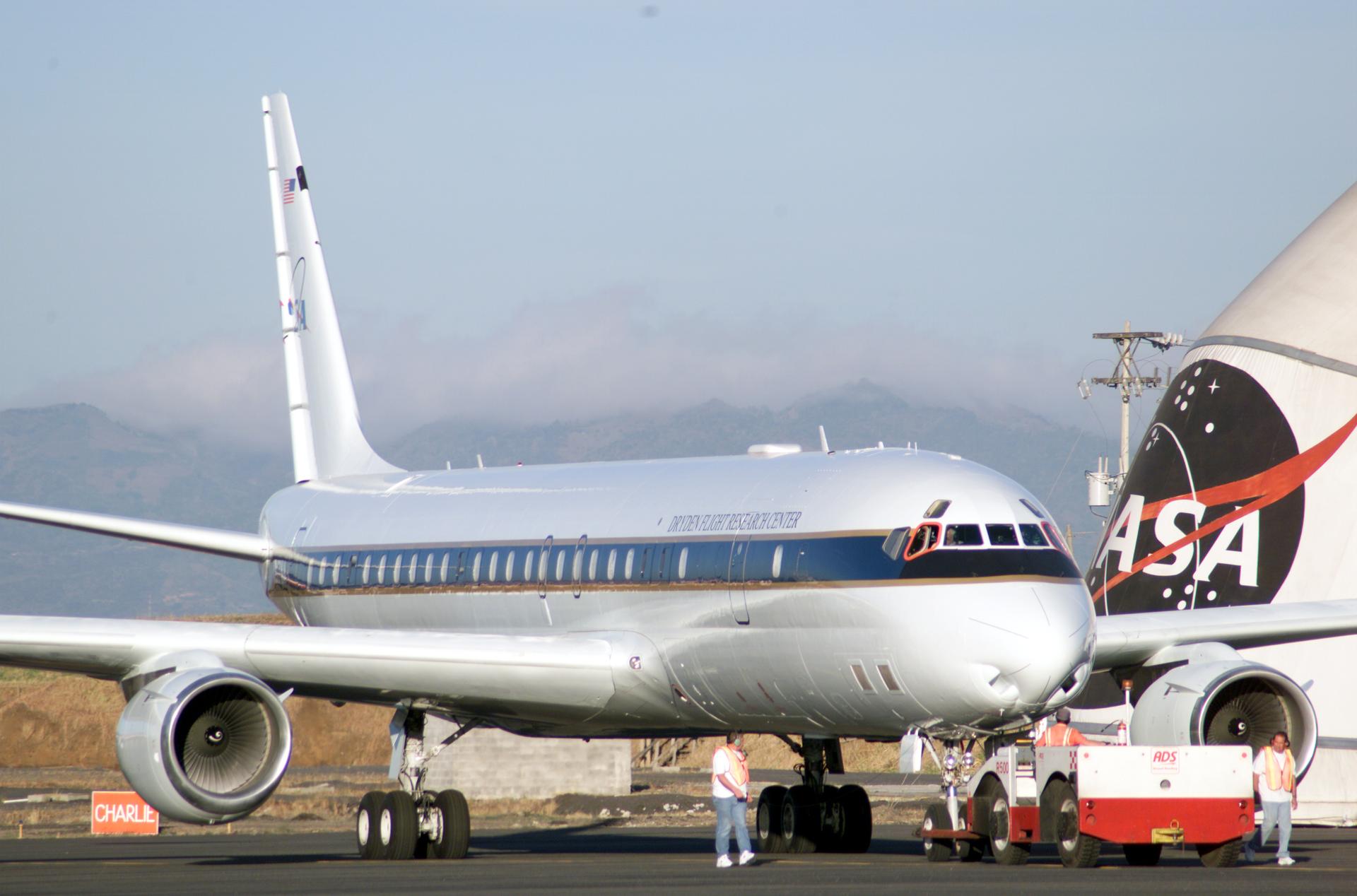 NASA Dryden's DC-8 on the ramp at Jaun Santamaria International Airport, San Jose, Costa Rica during the AirSAR 2004 campaign. AirSAR 2004 is a three-week expedition by an international team of scientists that will use an all-weather imaging tool, called the Airborne Synthetic Aperture Radar (AirSAR), in a mission ranging from the tropical rain forests of Central America to frigid Antarctica.