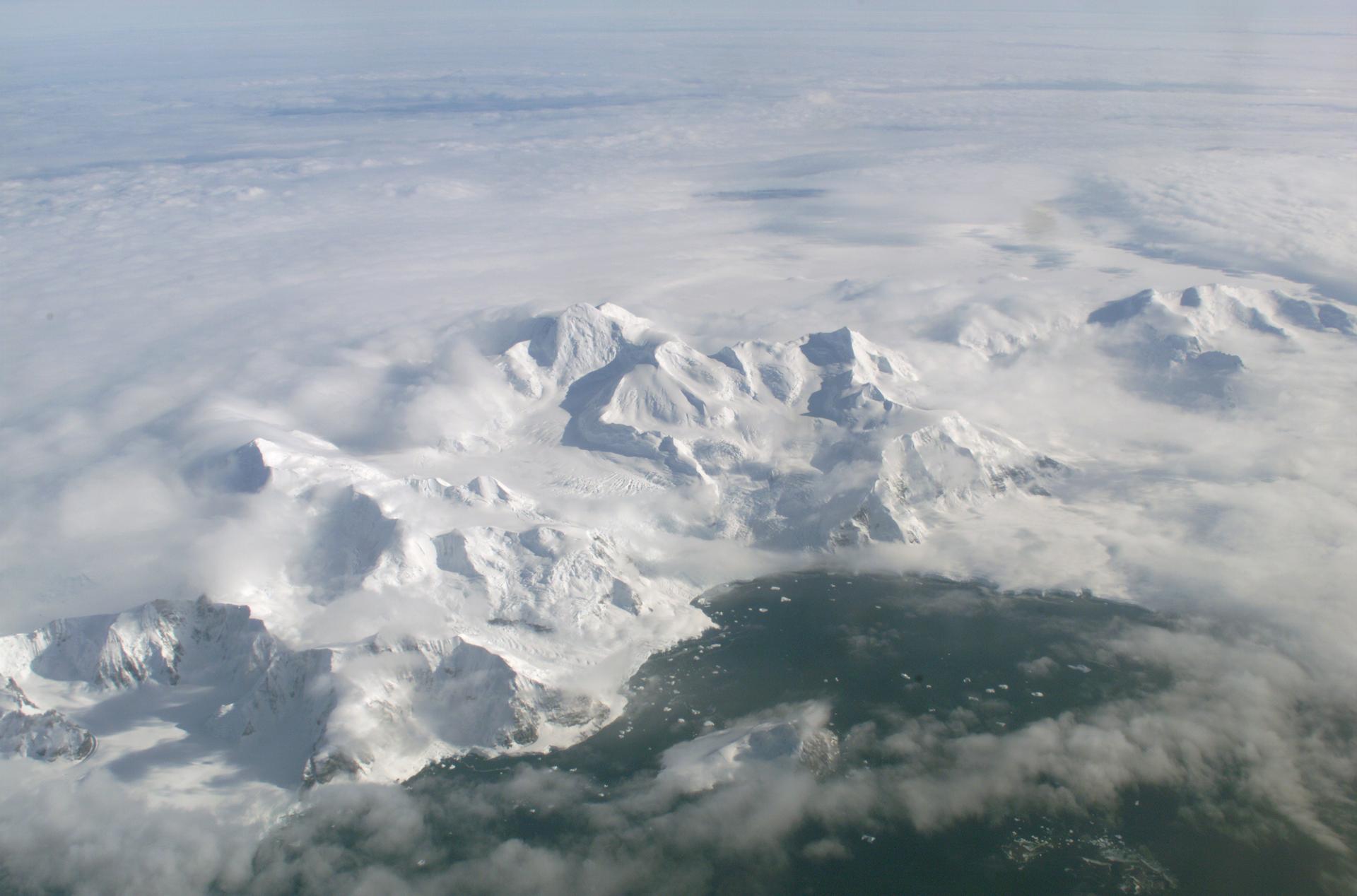 An AirSAR 2004 view from the DC-8 as it approaches the Larsen Ice Shelf, which is part of the Antarctic Peninsula. AirSAR 2004 is a three-week expedition in Central and South America by an international team of scientists that is using an all-weather imaging tool, called the Airborne Synthetic Aperture Radar (AirSAR), located onboard NASA's DC-8 airborne laboratory. Scientists from many parts of the world are combining ground research with NASA's AirSAR technology to improve and expand on the quality of research they are able to conduct. These photos are from the DC-8 aircraft while flying an AirSAR mission over Antarctica. The Antarctic Peninsula is more similar to Alaska and Patagonia than to the rest of the Antarctic continent. It is drained by fast glaciers, receives abundant precipitation, and melts significantly in the summer months. In recent decades, the Peninsula has experienced significant atmospheric warming (about 2 degrees C since 1950), which has triggered a vast and spectacular retreat of its floating ice shelves, glacier reduction, a decrease in permanent snow cover and a lengthening of the melt season. As a result, the contribution to sea level from this region could be rapid and substantial. With an area of 120,000 km, or ten times the Patagonia ice fields, the Peninsula could contribute as much as 0.4mm/yr sea level rise, which would be the largest single contribution to sea level from anywhere in the world. This region is being studied by NASA using a DC-8 equipped with the Airborne Synthetic Aperture Radar developed by scientists from NASA’s Jet Propulsion Laboratory. AirSAR will provide a baseline model and unprecedented mapping of the region. This data will make it possible to determine whether the warming trend is slowing, continuing or accelerating. AirSAR will also provide reliable information on ice shelf thickness to measure the contribution of the glaciers to sea level.