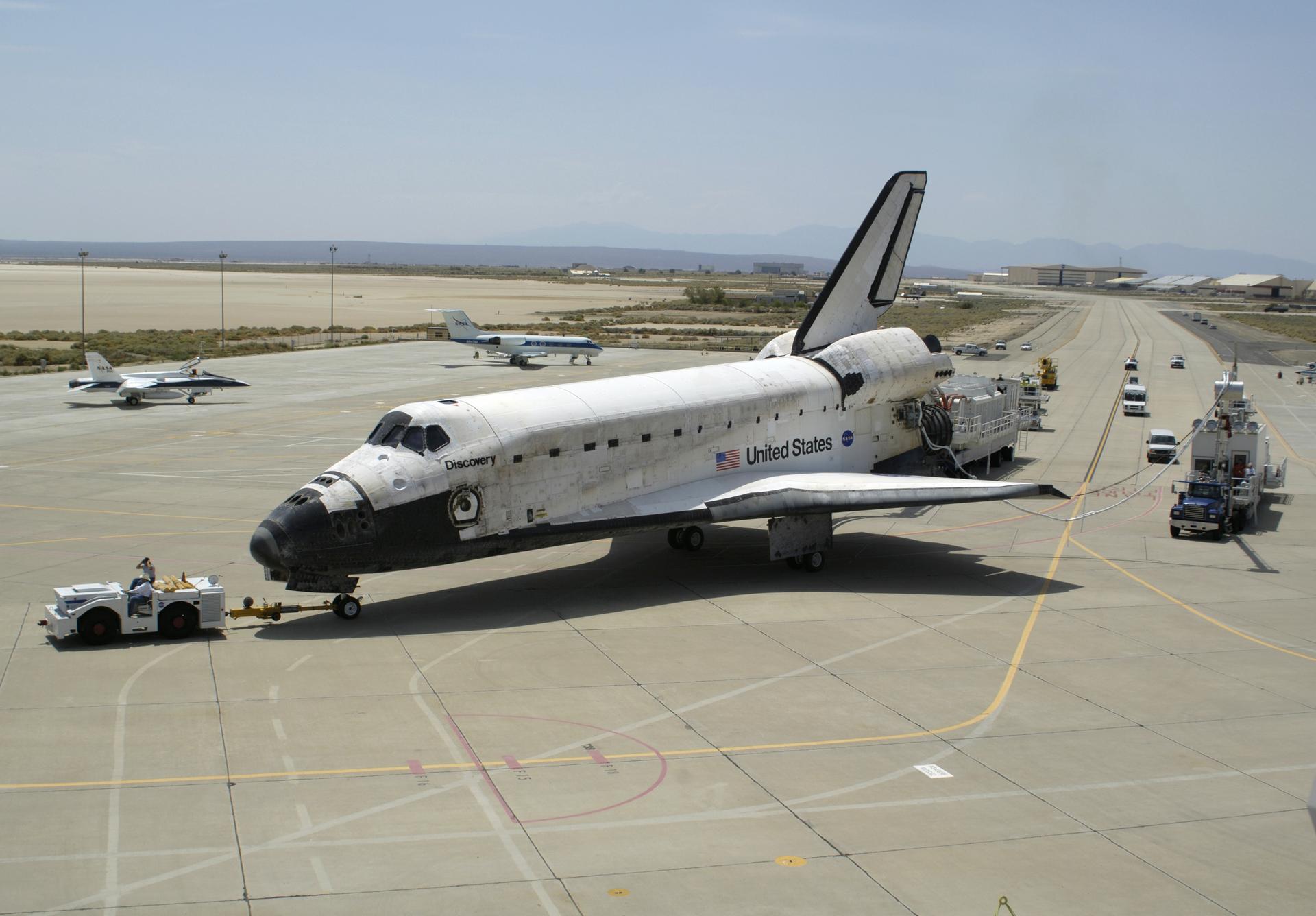 The Space Shuttle Discovery, accompanied by a convoy of recovery vehicles, is towed up the taxiway at NASA's Dryden Flight Research Center at Edwards Air Force Base, California, following its landing on August 9, 2005. Space Shuttle Discovery landed safely at NASA's Dryden Flight Research Center at Edwards Air Force Base in California at 5:11:22 a.m. PDT this morning, following the very successful 14-day STS-114 return to flight mission. During their two weeks in space, Commander Eileen Collins and her six crewmates tested out new safety procedures and delivered supplies and equipment the International Space Station. Discovery spent two weeks in space, where the crew demonstrated new methods to inspect and repair the Shuttle in orbit. The crew also delivered supplies, outfitted and performed maintenance on the International Space Station. A number of these tasks were conducted during three spacewalks. In an unprecedented event, spacewalkers were called upon to remove protruding gap fillers from the heat shield on Discovery's underbelly. In other spacewalk activities, astronauts installed an external platform onto the Station's Quest Airlock and replaced one of the orbital outpost's Control Moment Gyroscopes. Inside the Station, the STS-114 crew conducted joint operations with the Expedition 11 crew. They unloaded fresh supplies from the Shuttle and the Raffaello Multi-Purpose Logistics Module. Before Discovery undocked, the crews filled Raffeallo with unneeded items and returned to Shuttle payload bay. Discovery launched on July 26 and spent almost 14 days on orbit.