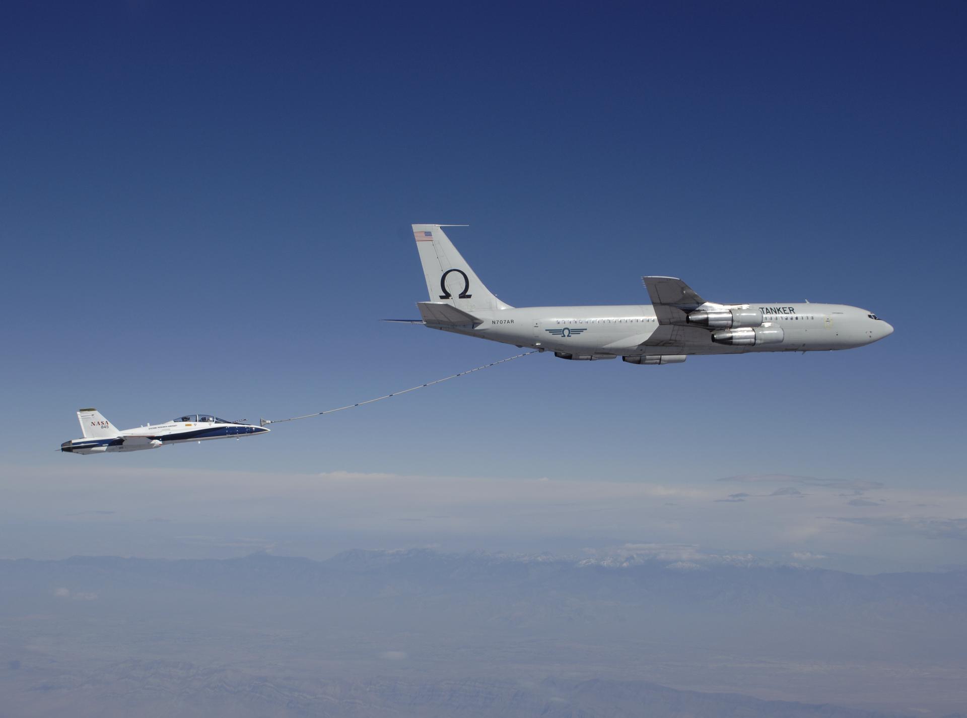 F/A-18 #845 behind an Omega Air Boeing 707 tanker during an Autonomous Airborne Refueling Demonstration (AARD) flight.