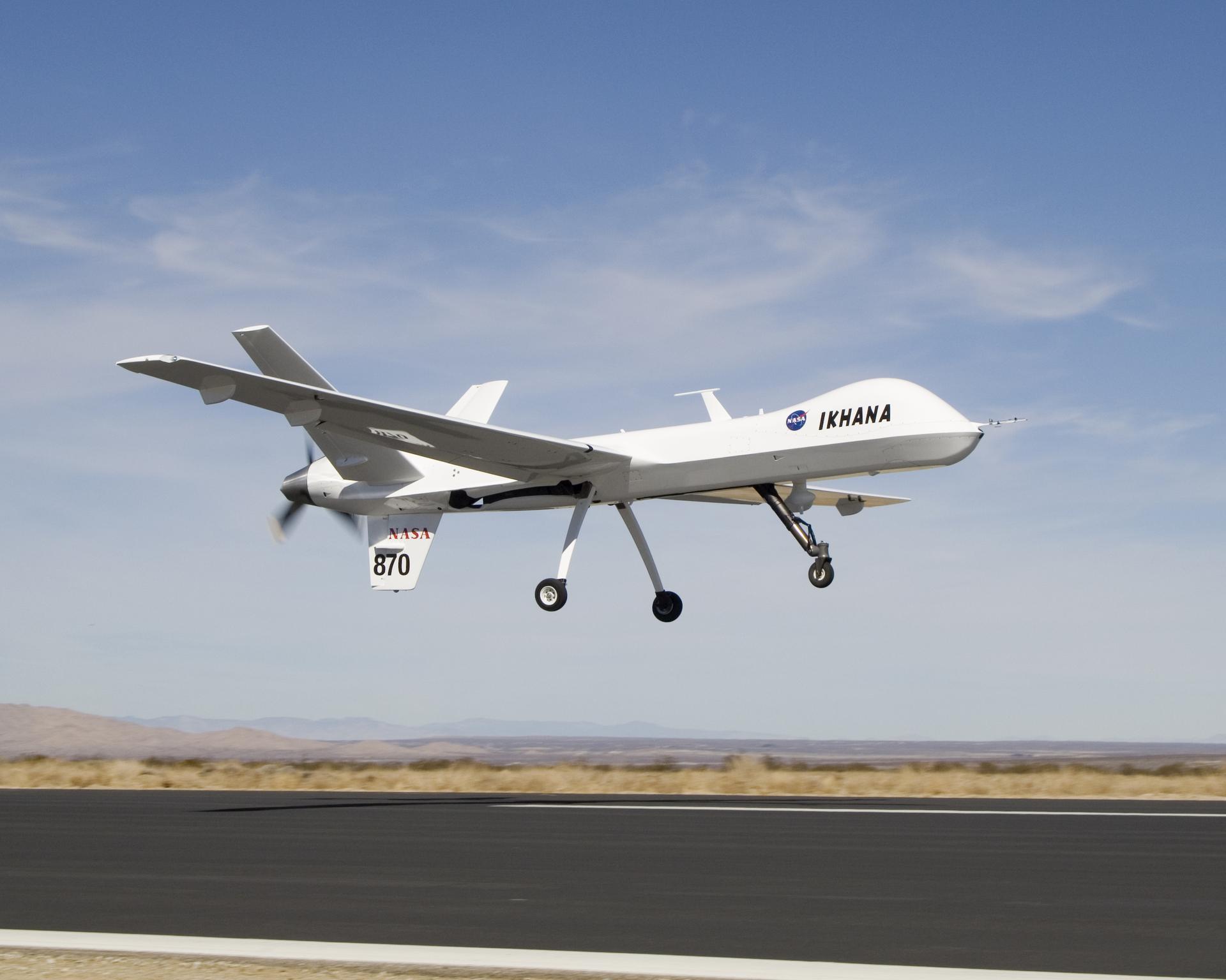 NASA's Ikhana, a civil variant of General Atomics' Predator B unmanned aircraft, takes to the sky for a morning checkout flight from the Grey Butte airfield.