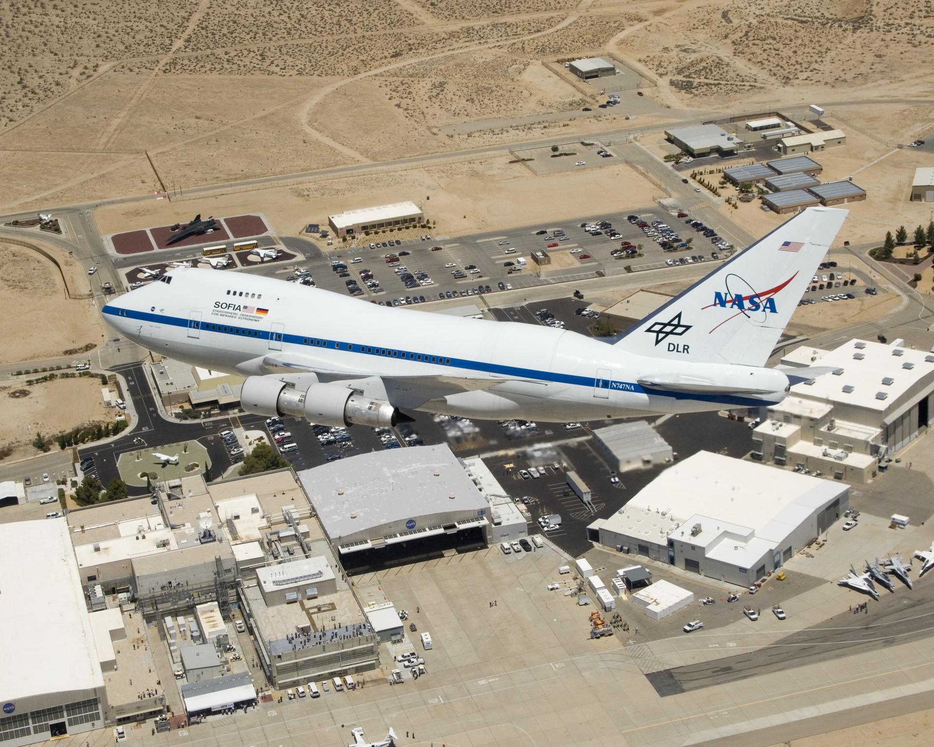 NASA's Stratospheric Observatory for Infrared Astronomy (SOFIA) Boeing 747SP flies over NASA's Dryden Flight Research Center after a ferry flight from Waco, Texas. NASA's Stratospheric Observatory for Infrared Astronomy, or SOFIA, arrived at NASA's Dryden Flight Research Center at Edwards Air Force Base, Calif. on May 31, 2007. The heavily modified Boeing 747SP was ferried to Dryden from Waco, Texas, where L-3 Communications Integrated Systems installed a German-built 2.5-meter infrared telescope and made other major modifications over the past several years. SOFIA is scheduled to undergo installation and integration of mission systems and a multi-phase flight test program at Dryden over the next three years that is expected to lead to a full operational capability to conduct astronomy missions in about 2010. During its expected 20-year lifetime, SOFIA will be capable of "Great Observatory" class astronomical science, providing astronomers with access to the visible, infrared and sub-millimeter spectrum with optimized performance in the mid-infrared to sub-millimeter range.