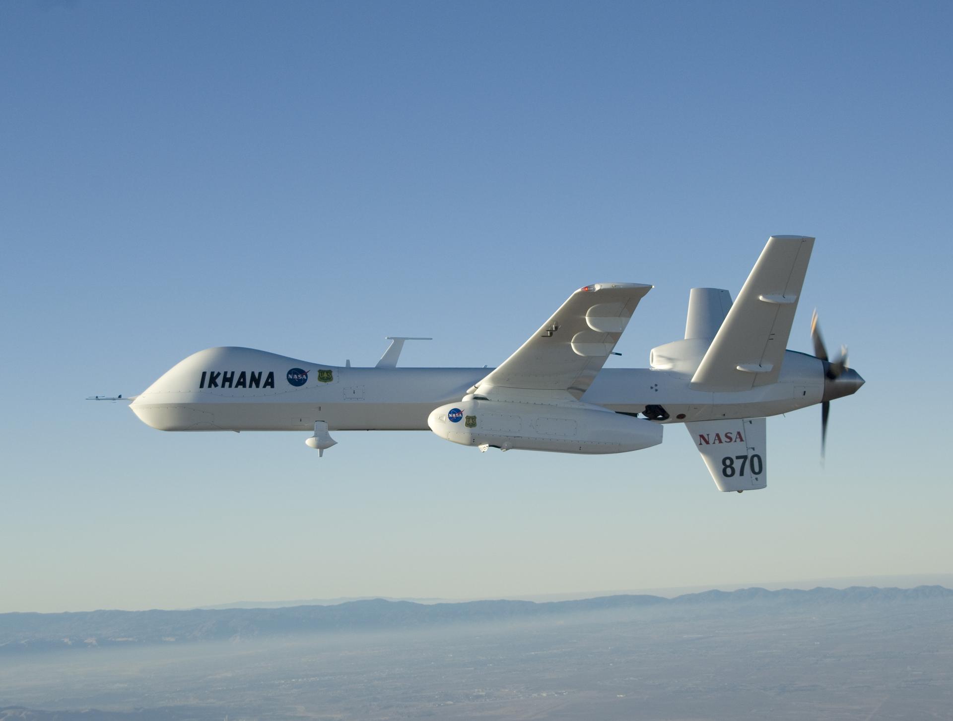 NASA's Ikhana remotely piloted aircraft soars over smoky terrain during a wildfire imaging demonstration mission in the late summer of 2007.