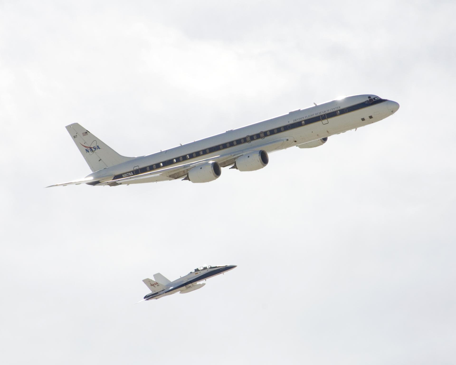 NASA’s DC-8 airborne science laboratory is shadowed by a NASA F/A-18 chase plane during a flyover of the Dryden Aircraft Operations Facility in Palmdale, Calif.