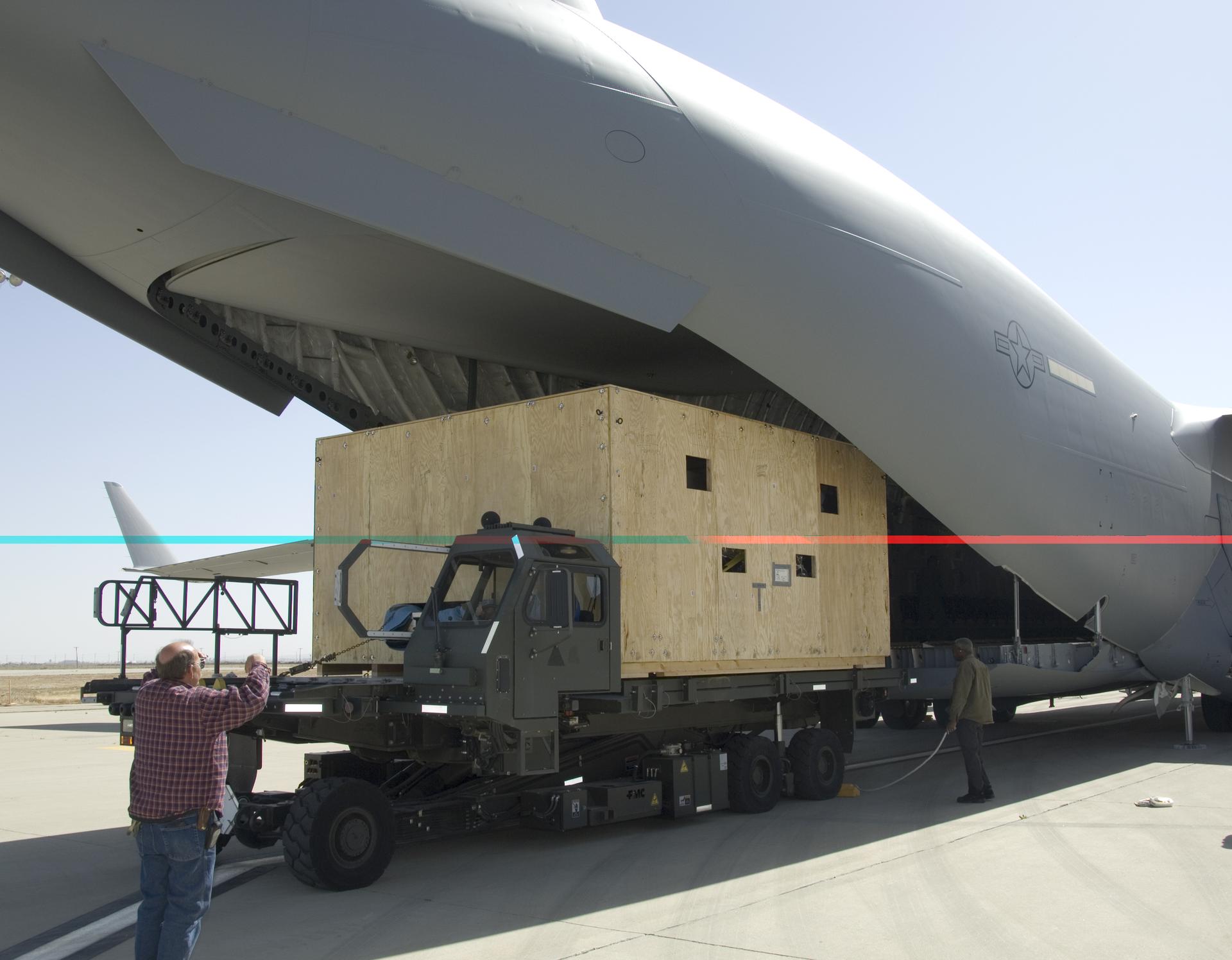A NASA Technician directs loading of the crated SOFIA primary mirror assembly into a C-17 for shipment to NASA Ames Research Center for finish coating