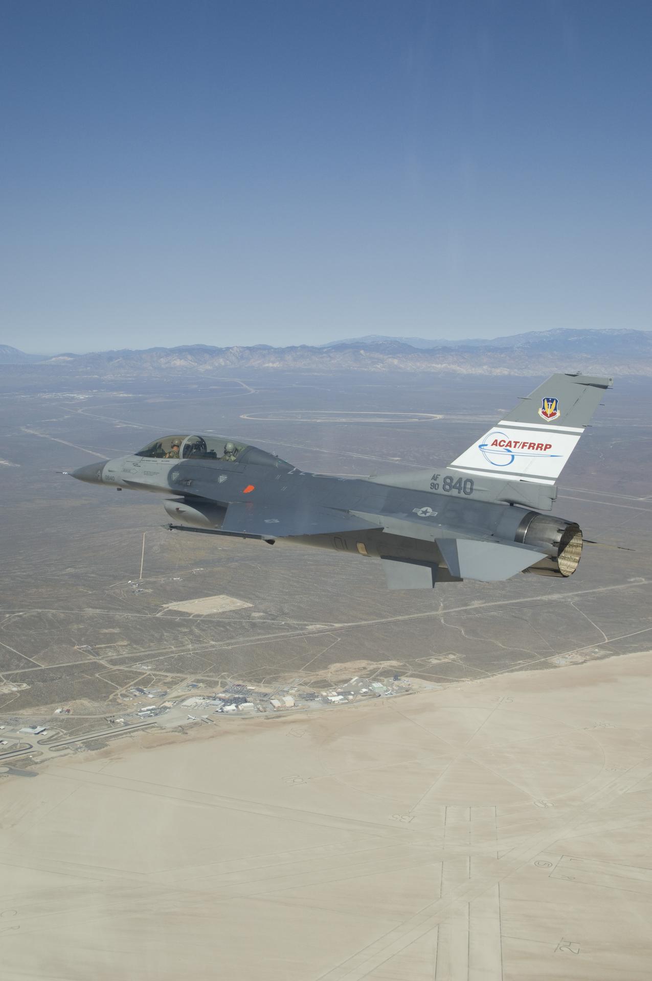 The U.S. Air Force's F-16D Automatic Collision Avoidance Technology (ACAT) aircraft flies over Rogers Dry Lake at Edwards Air Force Base, CA. NASA's Dryden Flight Research Center worked with the Air Force Research Laboratory in the ACAT Fighter Risk Reduction Project to develop collision avoidance technologies for fighter/attack aircraft that would reduce the risk of ground and mid-air collisions.