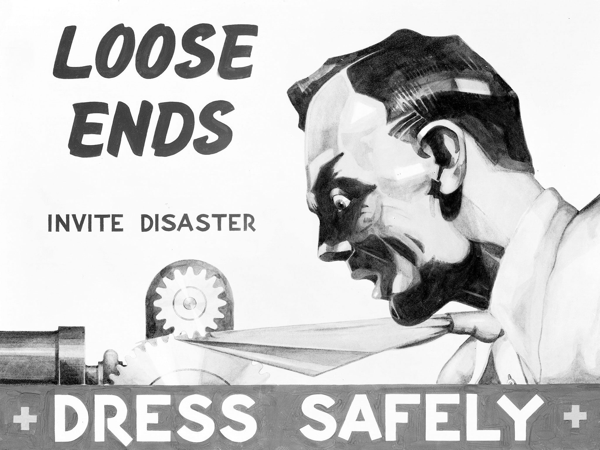 One of many safety posters produced by NACA artists during World War II. The Aircraft Engine Research Laboratory established a Safety Office in 1942 to coordinate and oversee safety-related activities. The lab struggled to maintain a full staff during the war when military research projects were at a peak. NACA management mandated six-day work weeks without overtime and the elimination of holidays. As such, workplace injuries were a serious threat to maintaining productivity needed to sustain the military’s aeronautics efforts.