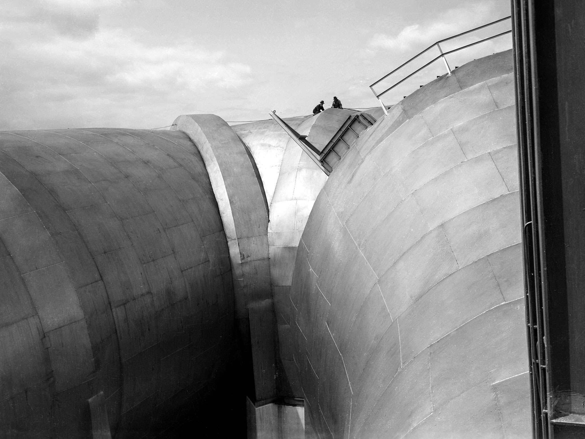 Two men on top of the Altitude Wind Tunnel (AWT) at the National Advisory Committee for Aeronautics (NACA) Aircraft Engine Research Laboratory. The tunnel was a massive rectangular structure, which for years provided one of the highest vantage points on the laboratory. The tunnel was 263 feet long on the north and south legs and 121 feet long on the east and west sides. The larger west end of the tunnel, seen here, was 51 feet in diameter. The east side of the tunnel was 31 feet in diameter at the southeast corner and 27 feet in diameter at the northeast. The throat section, which connected the northwest corner to the test section, narrowed sharply from 51 to 20 feet in diameter. The AWT’s altitude simulation required temperature and pressure fluctuations that made the design of the shell more difficult than other tunnels. The simultaneous decrease in both pressure and temperature inside the facility produced uneven stress loads, particularly on the support rings. The steel used in the primary tunnel structure was one inch thick to ensure that the shell did not collapse as the internal air pressure was dropped to simulate high altitudes. It was a massive amount of steel considering the World War II shortages. The shell was covered with several inches of fiberglass insulation to retain the refrigerated air and a thinner outer steel layer to protect the insulation against the weather. A unique system of rollers was used between the shell and its support piers. These rollers allowed for movement as the shell expanded or contracted during the altitude simulations. Certain sections would move as much as five inches during operation.