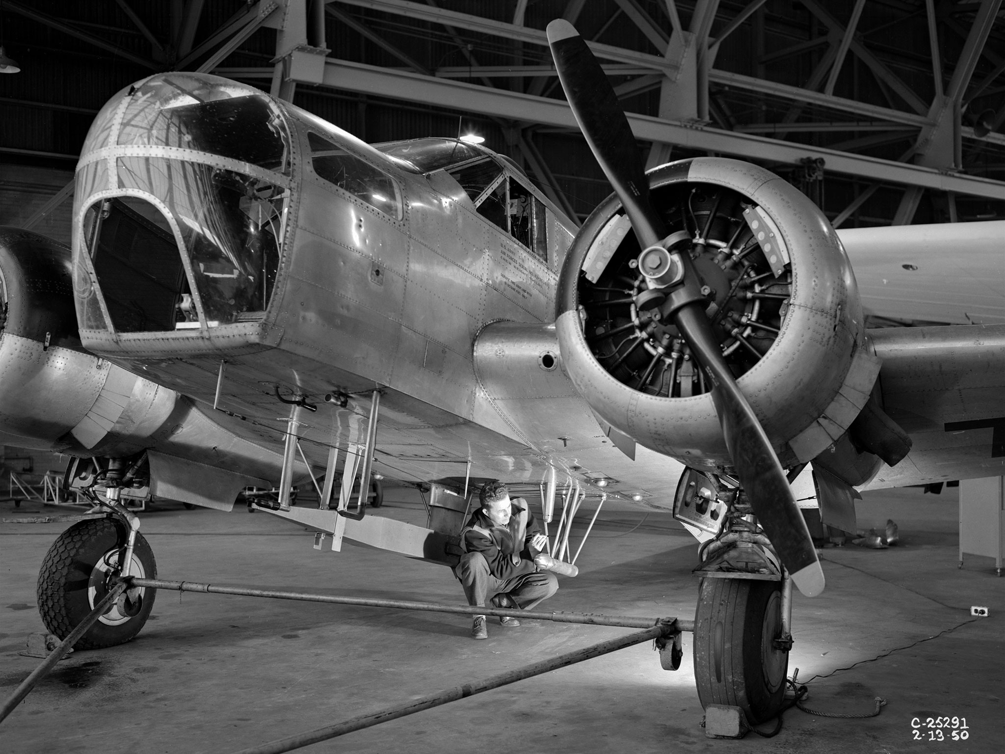 Researchers at the National Advisory Committee for Aeronautics (NACA) Lewis Flight Propulsion Laboratory conducted an extensive investigation into the composition of clouds and their effect on aircraft icing. The researcher in this photograph is installing cameras on a Beach AT-11 Kansan in order to photograph water droplets during flights through clouds. The twin engine AT-11 was the primary training aircraft for World War II bomber crews. The NACA acquired this aircraft in January 1946, shortly after the end of the war. The NACA Lewis’ icing research during the war focused on the resolution of icing problems for specific military aircraft. In 1947 the laboratory broadened its program and began systematically measuring and categorizing clouds and water droplets. The three main thrusts of the Lewis icing flight research were the development of better instrumentation, the accumulation of data on ice buildup during flight, and the measurement of droplet sizes in clouds. The NACA researchers developed several types of measurement devices for the icing flights, including modified cameras. The National Research Council of Canada experimented with high-speed cameras with a large magnification lens to photograph the droplets suspended in the air. In 1951 NACA Lewis developed and flight tested their own camera with a magnification of 32. The camera, mounted to an external strut, could be used every five seconds as the aircraft reached speeds up to 150 miles per hour. The initial flight tests through cumulus clouds demonstrated that droplet size distribution could be studied.