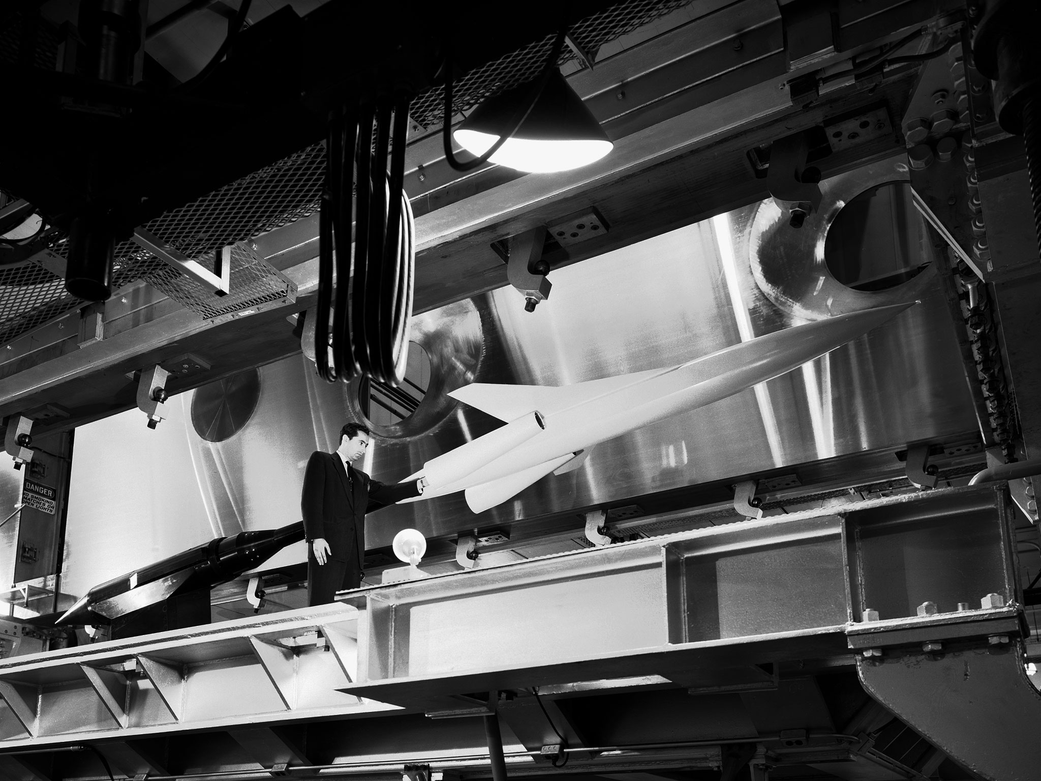 A researcher examines a model being installed in the test section of the 10- by 10-Foot Supersonic Wind Tunnel during the 1957 Inspection of the National Advisory Committee for Aeronautics (NACA) Lewis Flight Propulsion Laboratory. The NACA held its annual Inspection at one of its three research laboratories. Representatives from the military, aeronautical industry, universities, and the press were invited to the laboratory to be briefed on the NACA’s latest research efforts and tour the state- of- the- art test facilities. Over 1700 people visited the NACA Lewis in Cleveland, Ohio during the October 7 - 10, 1957 Inspection. NACA researchers Leonard Obery, seen here, James Connors, Leonard, Stitt, David Bowditch gave presentations on high Mach number turbojets at the 10- by 10 tunnel. It had been only 15 years since a jet aircraft had first flown in the US. Since then the sound barrier had been broken and speeds of Mach 2.5 had been achieved. In the late 1950s NACA researchers sought to create an engine that could achieve Mach 4. This type of engine would require an extremely long inlet and nozzle which would have to be capable of adjusting their diameter for different speeds. A Mach 4 engine would require new composite materials to withstand the severe conditions, modified airframes to hold the longer engines, and high temperature seals and lubricants. The 10- by 10-foot tunnel, which had only been in operation for a year and a half, would play a critical role in these studies. NACA researchers at other facilities discussed high energy aircraft fuels and rocket propellants, aircraft noise reduction, hypersonic flight, nuclear propulsion, and high temperature materials.