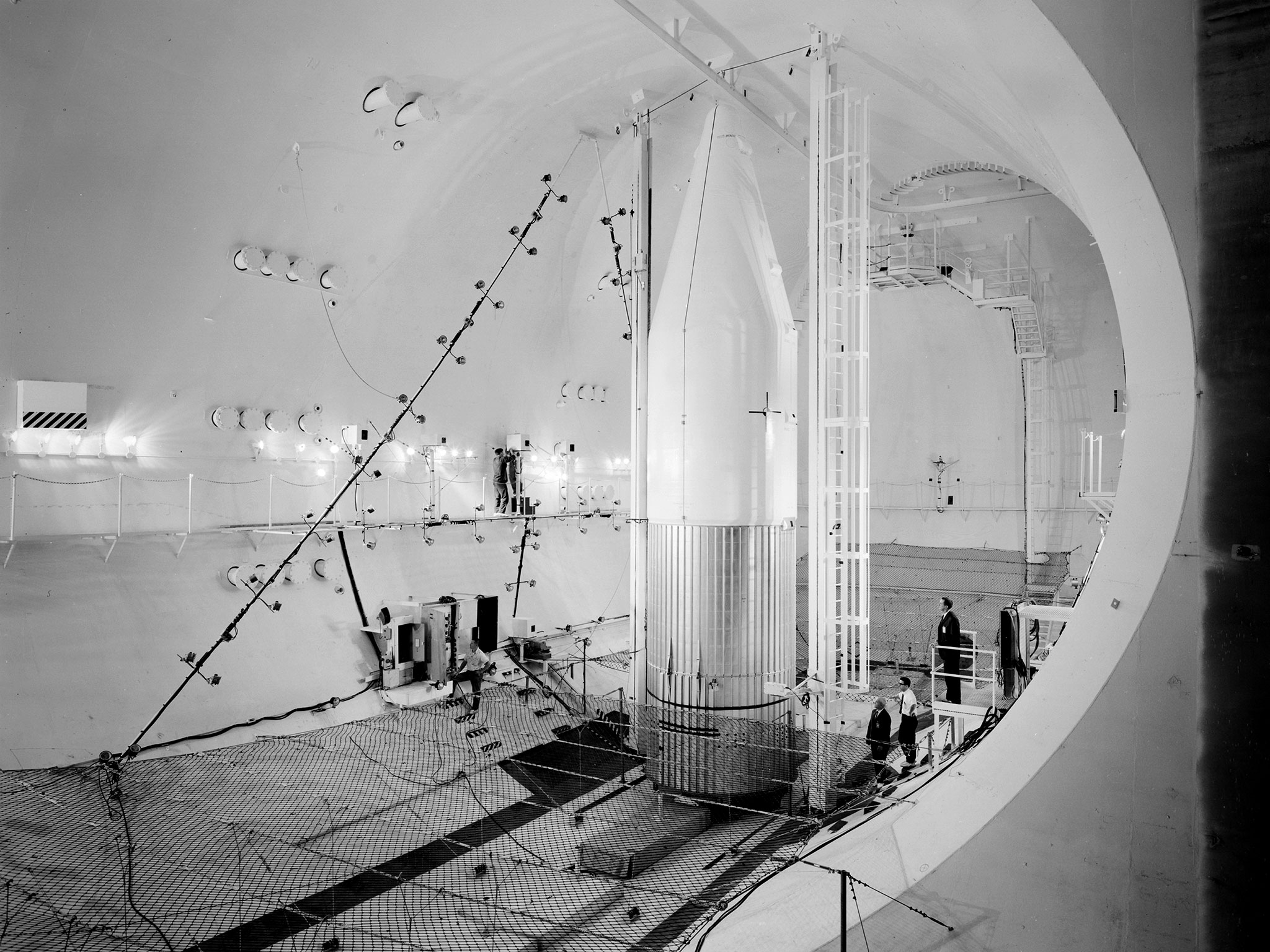 Preparations for a shroud jettison test for the Orbiting Astronomical Observatory-1 (OAO-1) satellite in the Space Power Chambers facility at the National Aeronautics and Space Administration (NASA) Lewis Research Center. The satellite was to be launched on an Atlas-Agena rocket in the spring of 1966. The 3900-pound payload was the heaviest ever attempted by Agena. The satellite was the first of three equipped with powerful telescopes to study ultraviolet data from specific stars and galaxies. In-depth observations were not possible from Earth-bound telescopes because of the filtering and distortion of the atmosphere. The OAO-1 satellite was wider in diameter than the Agena stage, so a new clamshell shroud was created to enclose both the satellite and the Agena. The clamshell shroud consisted of three sections that enclosed both the Agena and OAO-1: a fiberglass nose fairing and aluminum mid and aft fairings. The upper two fairings separated when the Atlas engines stopped, and the aft fairing fell away with the Atlas upon separation from the upper stages The large altitude tank in the Space Power Chambers could simulate altitudes up to 100,000 feet. Three shroud jettison tests were run in July 1965 and the first week of August at a simulated altitude of 20 miles. The April 8, 1966 launch from Cape Canaveral went smoothly, but the OAO-1 satellite failed after only 90 minutes due to a battery failure.