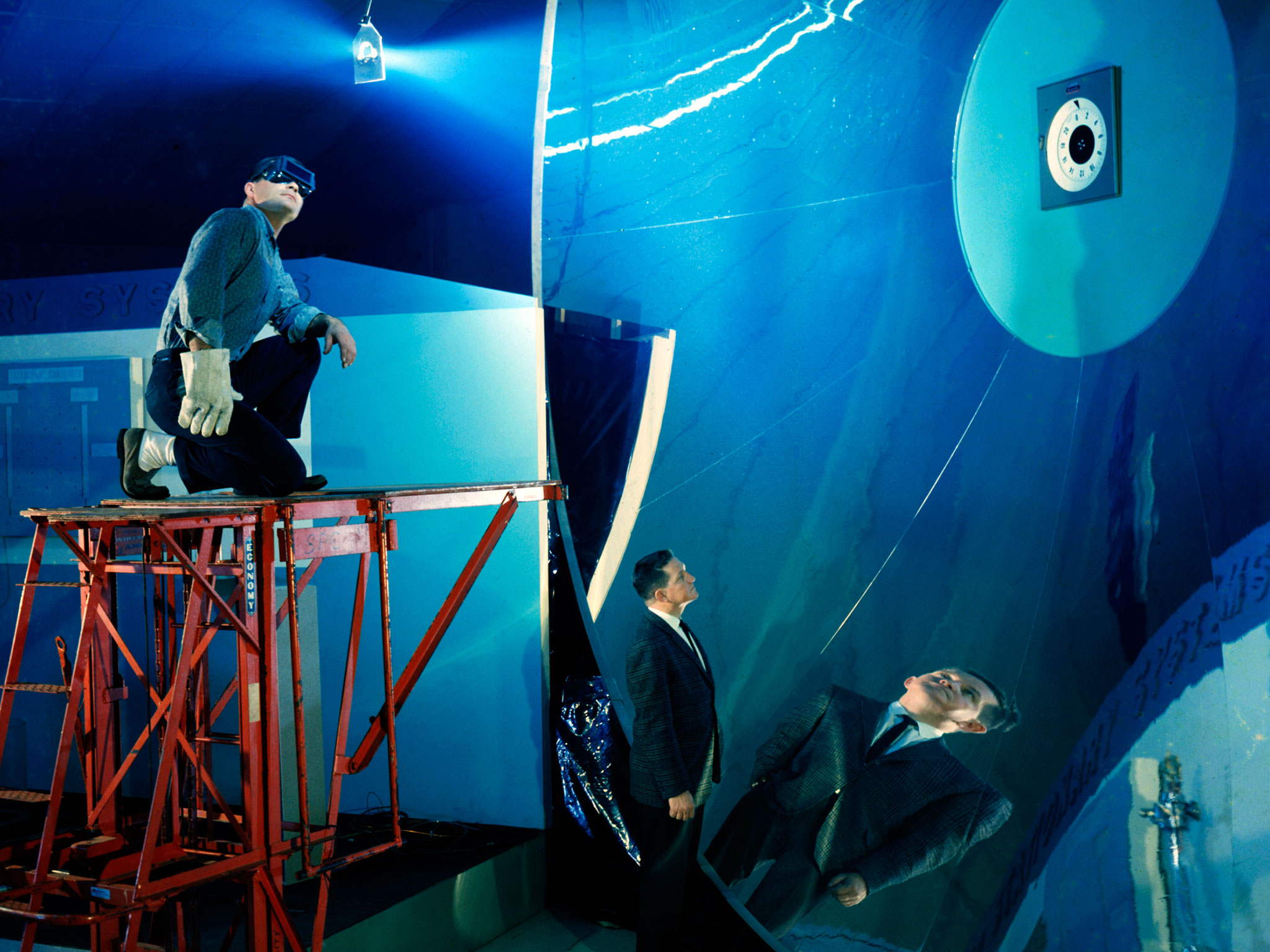 NASA’s Lewis Research Center conducted extensive research programs in the 1960s and 1970s to develop systems that provide electrical power in space. One system, the Brayton cycle engine, converted solar thermal energy into electrical power. This system operated on a closed-loop Brayton thermodynamic cycle. The Brayton system relied on this large mirror to collect radiation from the sun. The mirror concentrated the Sun's rays on a heat storage receiver which warmed the Brayton system’s working fluid, a helium-xenon gas mixture. The heated fluid powered the system’s generator which produced power. In the mid-1960s Lewis researchers constructed this 30-foot diameter prototype of a parabolic solar mirror for the Brayton cycle system. The mirror had to be rigid, impervious to micrometeorite strikes, and lightweight. This mirror was comprised of twelve 1-inch thick magnesium plate sections that were coated with aluminum. The mirror could be compactly broken into its sections for launch.