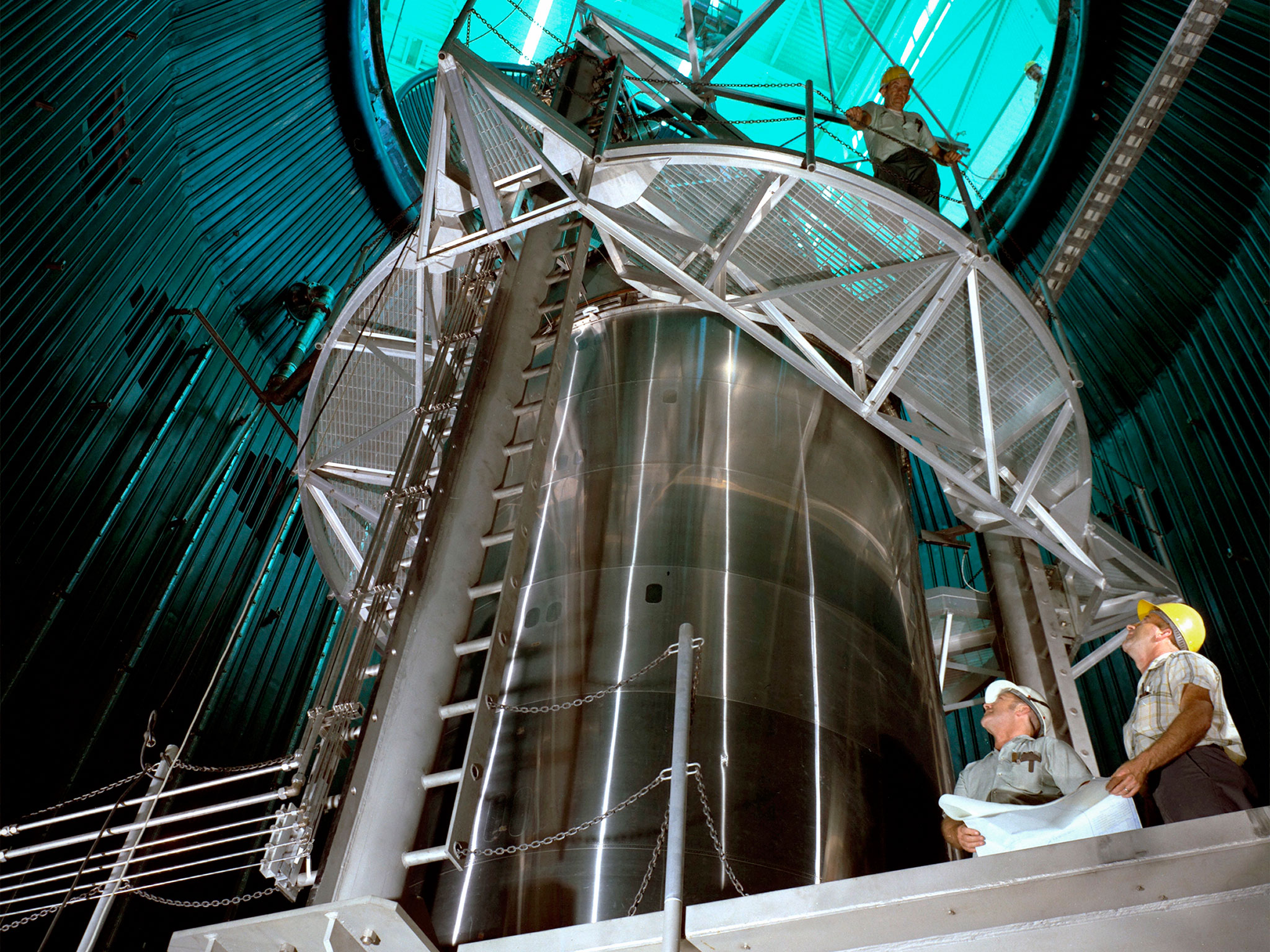A Centaur second-stage rocket in the Space Propulsion Research Facility, better known as B‒2, operating at NASA’s Plum Brook Station in Sandusky, Ohio. Centaur was designed to be used with an Atlas booster to send the Surveyor spacecraft to the moon in the mid-1960s. After those missions, the rocket was modified to launch a series of astronomical observation satellites into orbit and send space probes to other planets. Researchers conducted a series of systems tests at the Plum Brook test stands to improve the Centaur fuel pumping system. Follow up full-scale tests in the B-2 facility led to the eventual removal of the boost pumps from the design. This reduced the system’s complexity and significantly reduced the cost of a Centaur rocket. The Centaur tests were the first use of the new B-2 facility. B‒2 was the world's only high altitude test facility capable of full-scale rocket engine and launch vehicle system level tests. It was created to test rocket propulsion systems with up to 100,000 pounds of thrust in a simulated space environment. The facility has the unique ability to maintain a vacuum at the rocket’s nozzle while the engine is firing. The rocket fires into a 120-foot deep spray chamber which cools the exhaust before it is ejected outside the facility. B‒2 simulated space using giant diffusion pumps to reduce chamber pressure 10-6 torr, nitrogen-filled cold walls create cryogenic temperatures, and quartz lamps replicate the radiation of the sun.