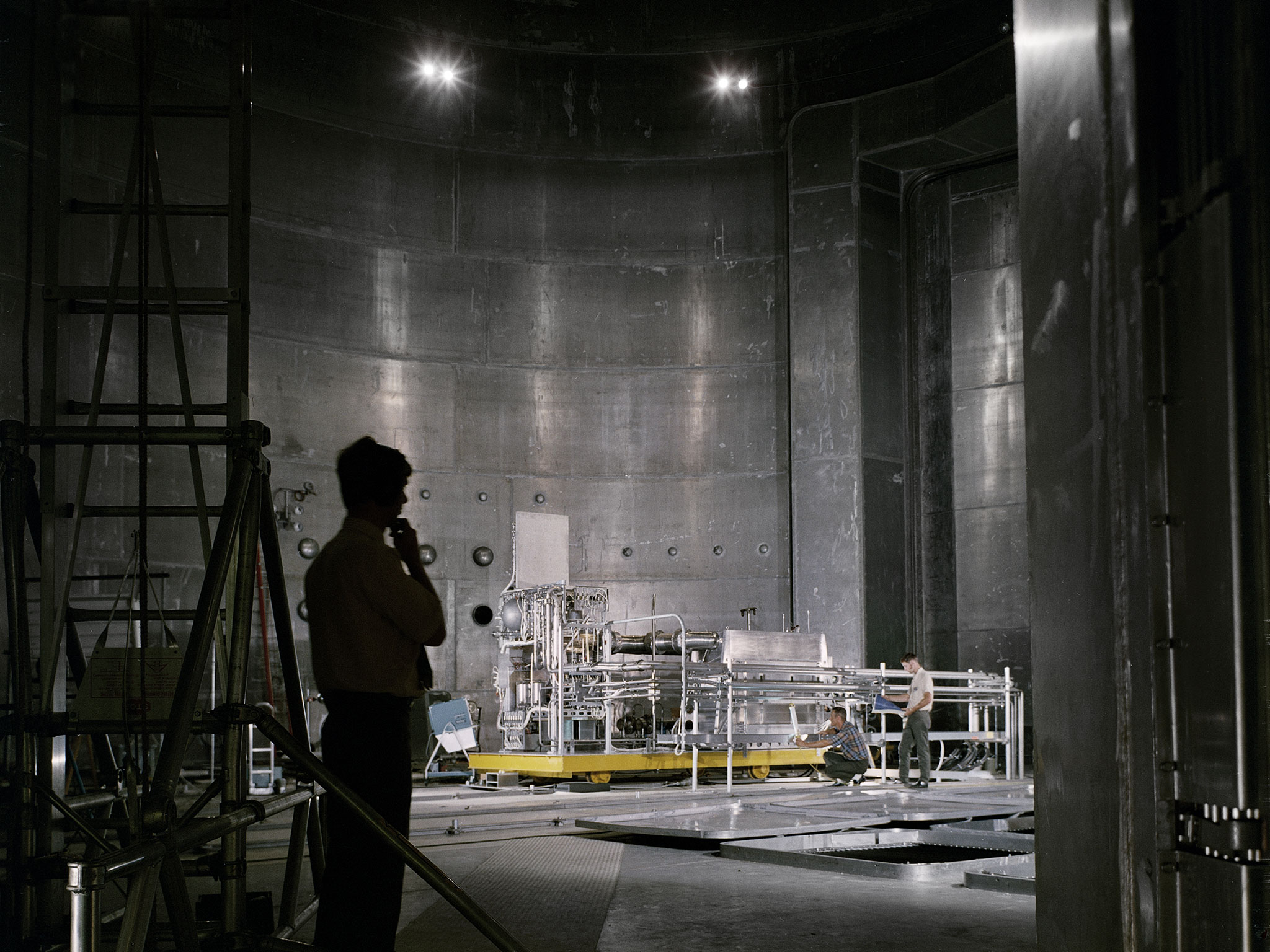 Set up of a Brayton Cycle Power System test in the Space Power Facility’s massive vacuum chamber at the National Aeronautics and Space Administration’s (NASA) Plum Brook Station in Sandusky, Ohio. The $28.4-million facility, which began operations in 1969, is the largest high vacuum chamber ever built. The chamber is 100 feet in diameter and 120 feet high. It can produce a vacuum deep enough to simulate the conditions at 300 miles altitude. The Space Power Facility was originally designed to test nuclear-power sources for spacecraft, but it was never used for that purpose. The Space Power Facility was first used to test a 15 to 20-kilowatt Brayton Cycle Power System for space applications. Three different methods of simulating solar heat were employed during the tests. Lewis researchers studied the Brayton power system extensively in the 1960s and 1970s. The Brayton engine converted solar thermal energy into electrical power. The system operated on a closed-loop Brayton thermodynamic cycle with a helium-xenon gas mixture as its working fluid. A space radiator was designed to serve as the system’s waste heat rejecter. The radiator was later installed in the vacuum chamber and tested in a simulated space environment to determine its effect on the power conversion system. The Brayton system was subjected to simulated orbits with 62 minutes of sun and 34 minutes of shade.