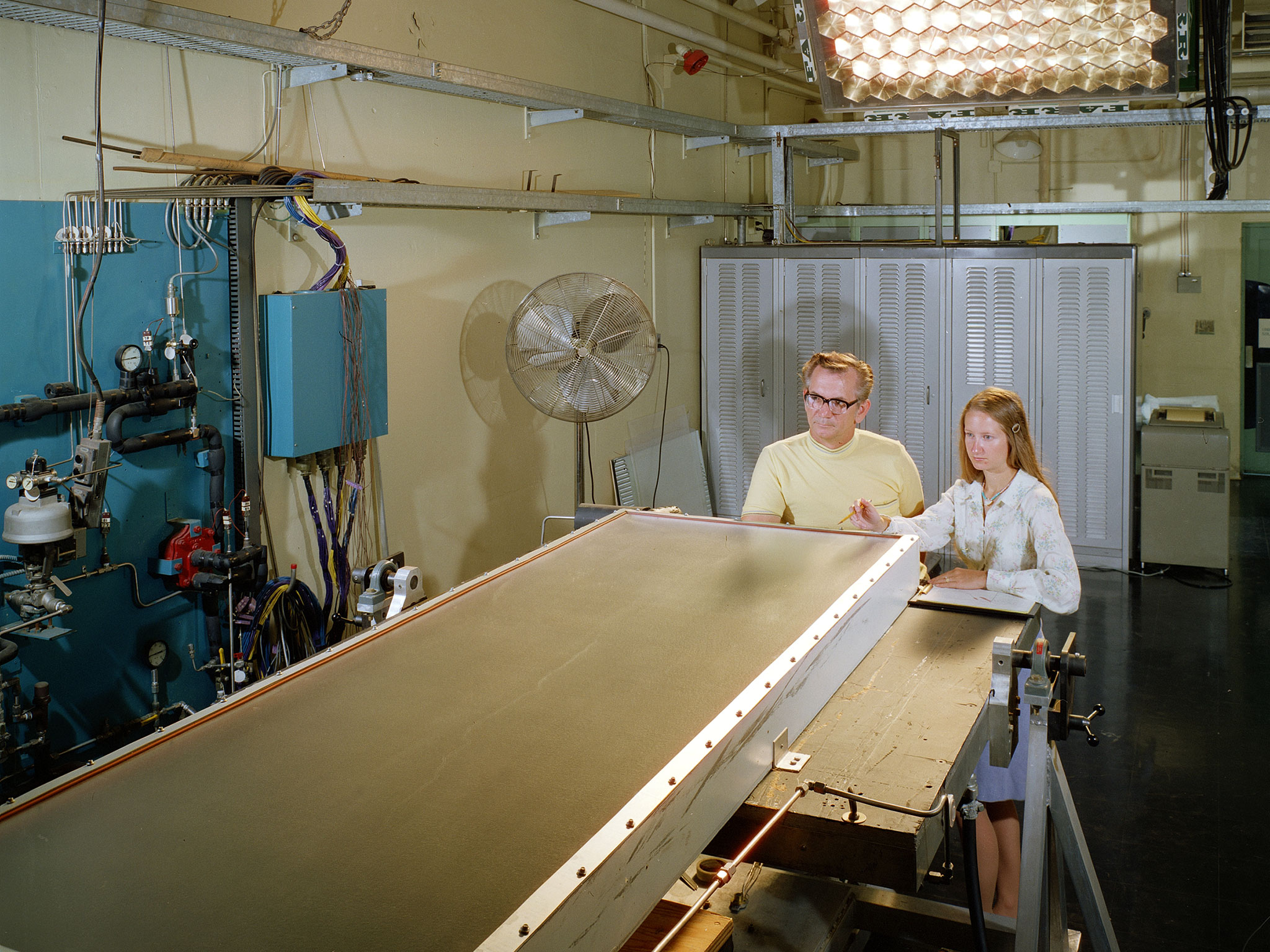 Researcher Susan Johnson and a mechanic examine a flat-plate solar collector in the Solar Simulator Cell in the High Temperature Composites Laboratory at the National Aeronautics and Space Administration (NASA) Lewis Research Center. The Solar Simulator Cell allowed the researchers to control the radiation levels, air temperature, airflow, and fluid flow. The flat-plate collector, seen in a horizontal position here, was directed at the solar simulator, seen above Johnson, during the tests. Lewis researchers were studying the efficiency of various flat- plate solar collector designs in the 1970s for temperature control systems in buildings. The collectors consisted of a cover material, absorber plate, and parallel flow configuration. The collector’s absorber material and coating, covers, honeycomb material, mirrors, vacuum, and tube attachment could all be modified. Johnson’s study analyzed 35 collectors. Johnson, a lifelong pilot, joined NASA Lewis in 1974. The flat-plate solar collectors, seen here, were her first research project. Johnson also investigated advanced heat engines for general aviation and evaluated variable geometry combustors and liners. Johnson earned the Cleveland Technical Society’s Technical Achievement Award in 1984.